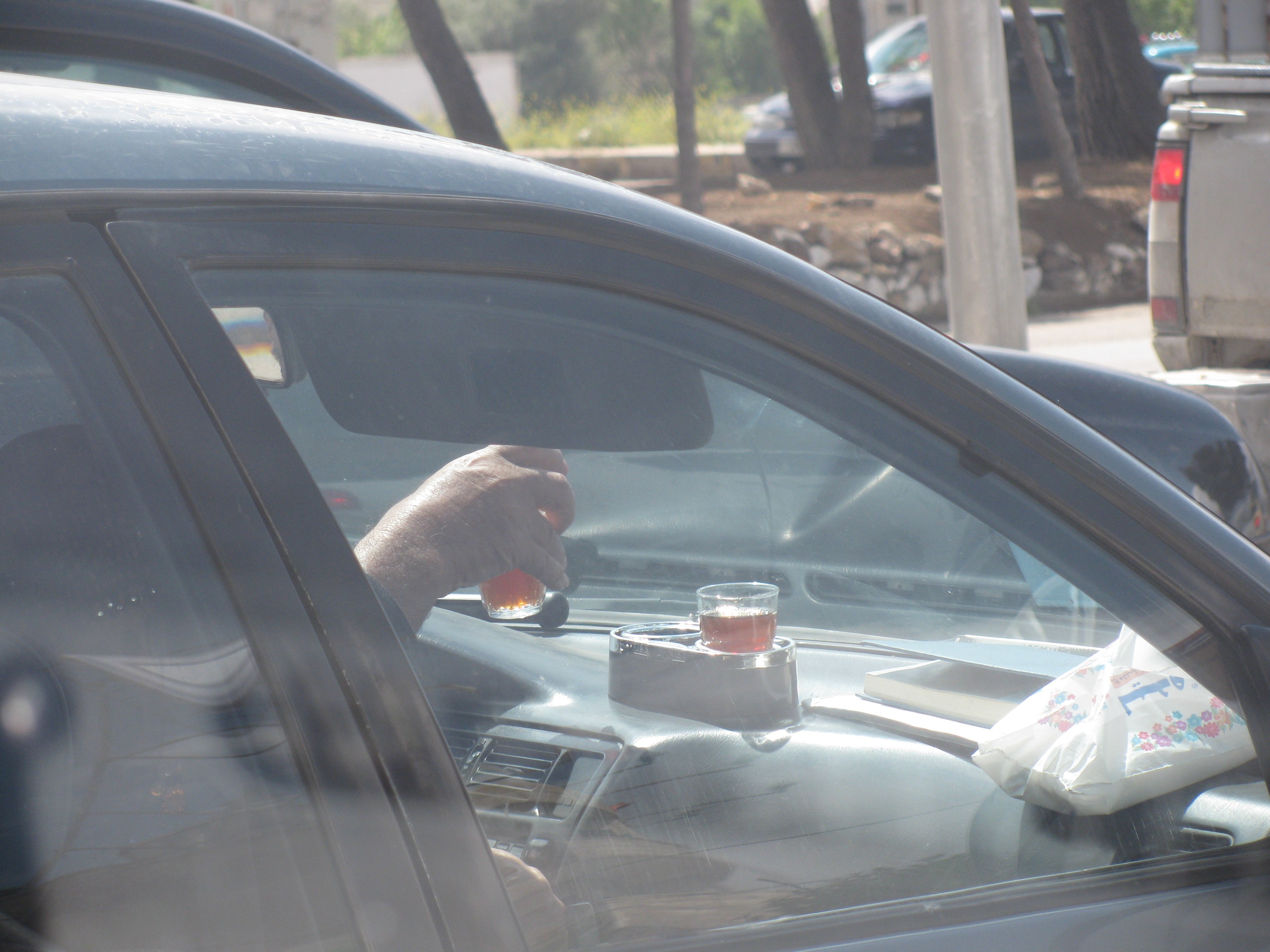 I’m not going to say exactly where this photograph was taken, because unfortunately you can see this sort of thing all over the world. The only unusual thing here is the conveniently placed holder and use of proper glass tea cups. And of course, the fact that it is in plain sight. But the way I look at it, if you are going to have your breakfast in morning traffic, at least it’s nice to do it with a touch of class.