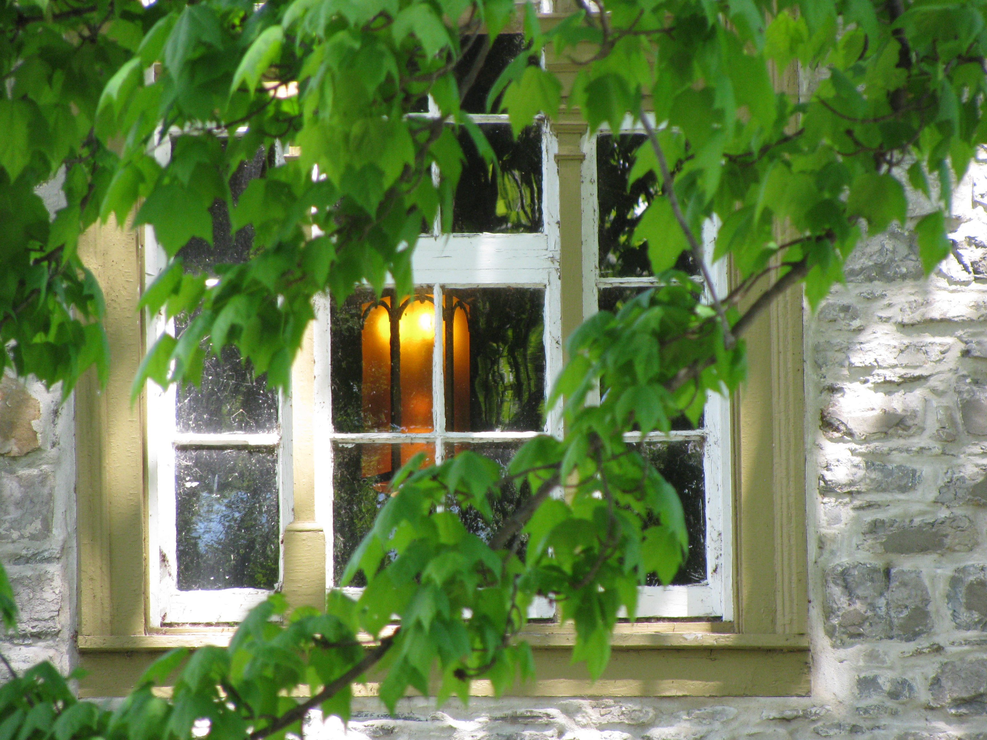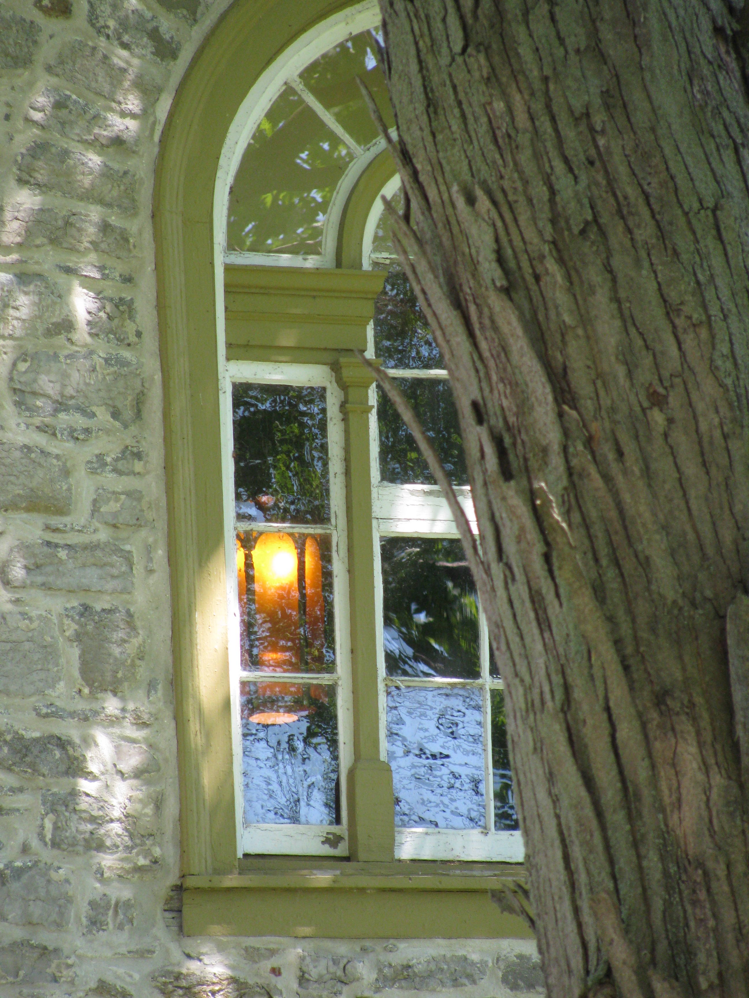 What does this have to do with the pictures at the start of this post? The windows are in the 200 year old stone church, shaded by a 200 year old maple tree. The shade is dark enough that you can see the lights inside the church. At the same time, in other panes of glass you can see the reflection of the sun coming through the leaves. The contrast appealed to me, as it so often does. I hope it speaks to you as well.