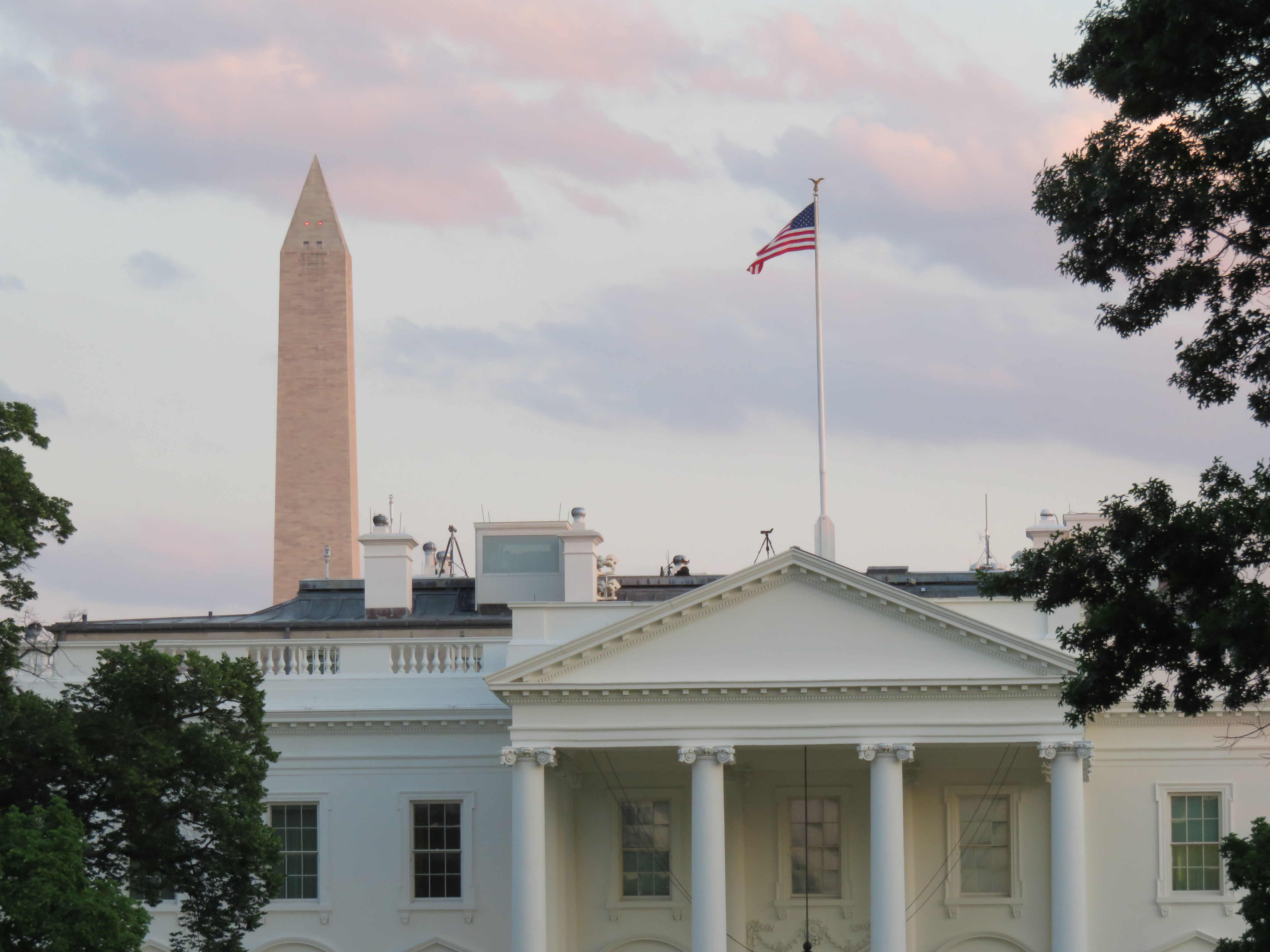 The Washington monument, illuminated by the setting sun, visible over the White House.