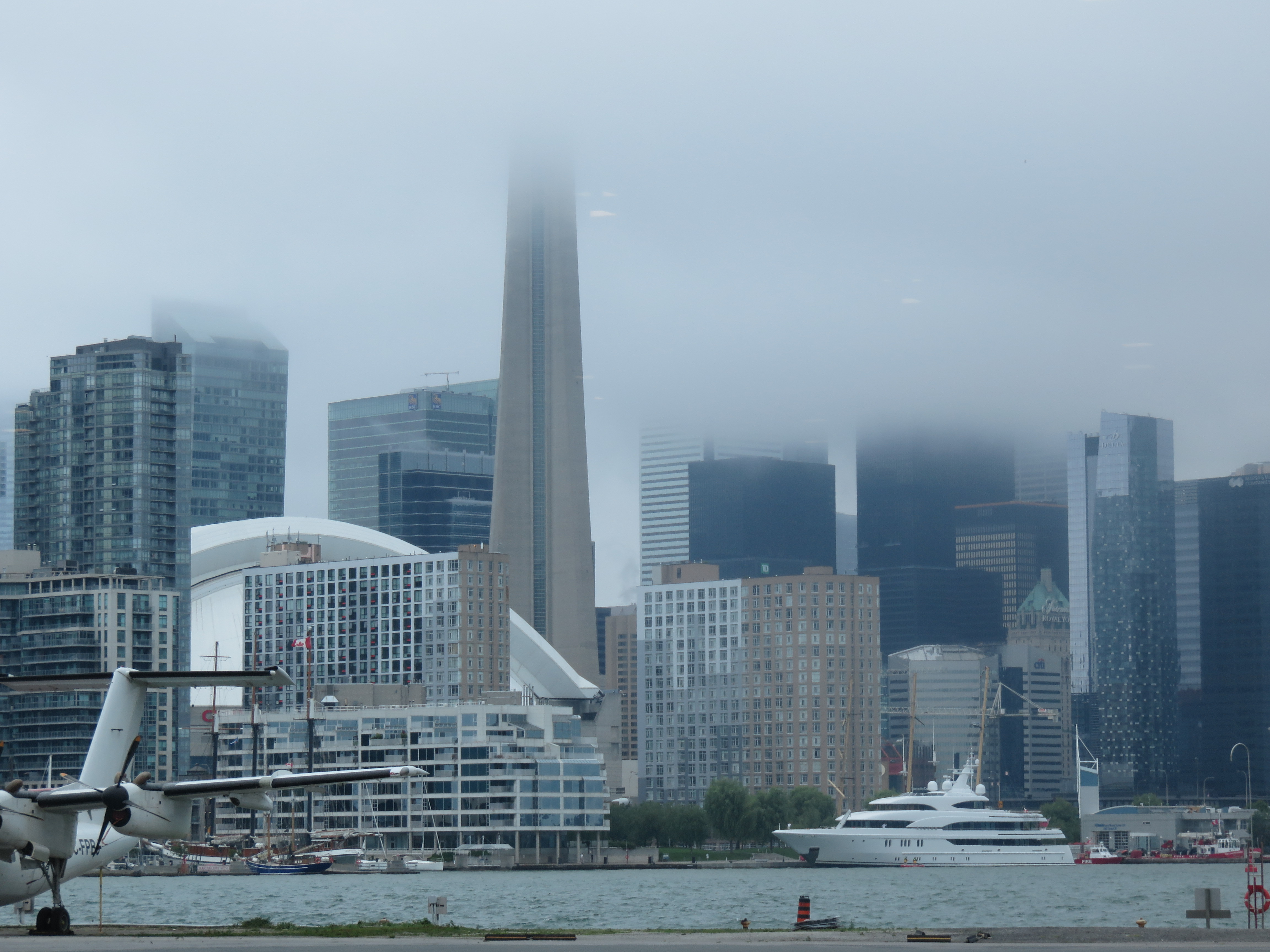 I was fortunate enough to have a meeting in New York City and decided to stay on for a few extra days to enjoy the city. But first we had to get there, and the best flights took us through Toronto Island airport. While changing planes because of a flat tire – yes, a flat tire – I was able to take this picture of Toronto. The low hanging clouds masked the top of the CN Tower and many of the higher downtown buildings.