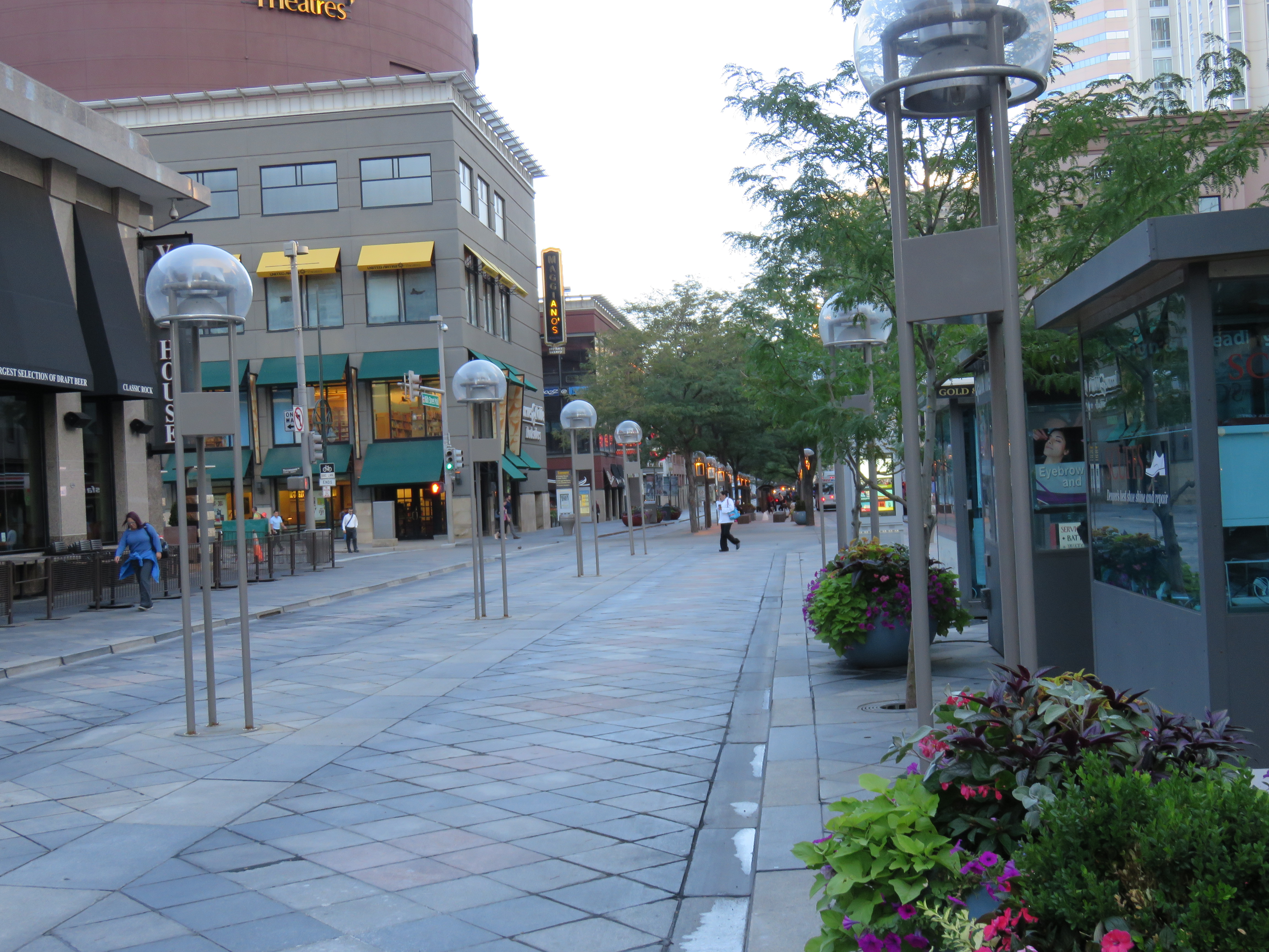 A long mostly-pedestrian mall runs for a dozen blocks through downtown Denver. I say “mostly-pedestrian” because a free bus service runs the length of the mall. But other than the risk of getting hit by a bus, it’s pretty safe. And at 7:00 AM the streets are nearly deserted of buses and pedestrians anyway. It provides a hint of what I might have seen if I hadn’t been in meetings all day.