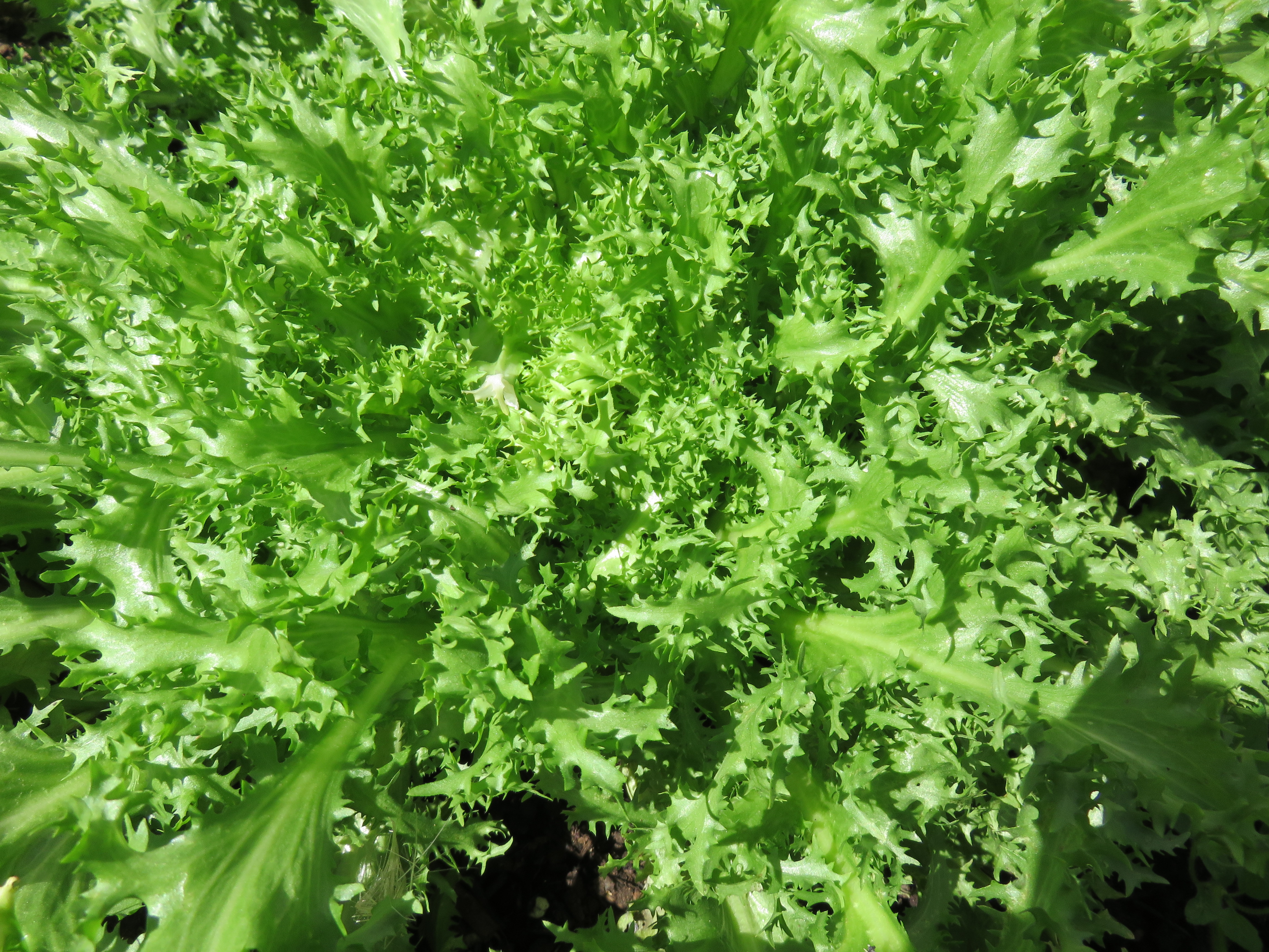 Salad Lyonnaise starts with frisee lettuce – really a type of endive. It is nearly impossible to find, at least around here, but fortunately this year we have some growing in our garden.