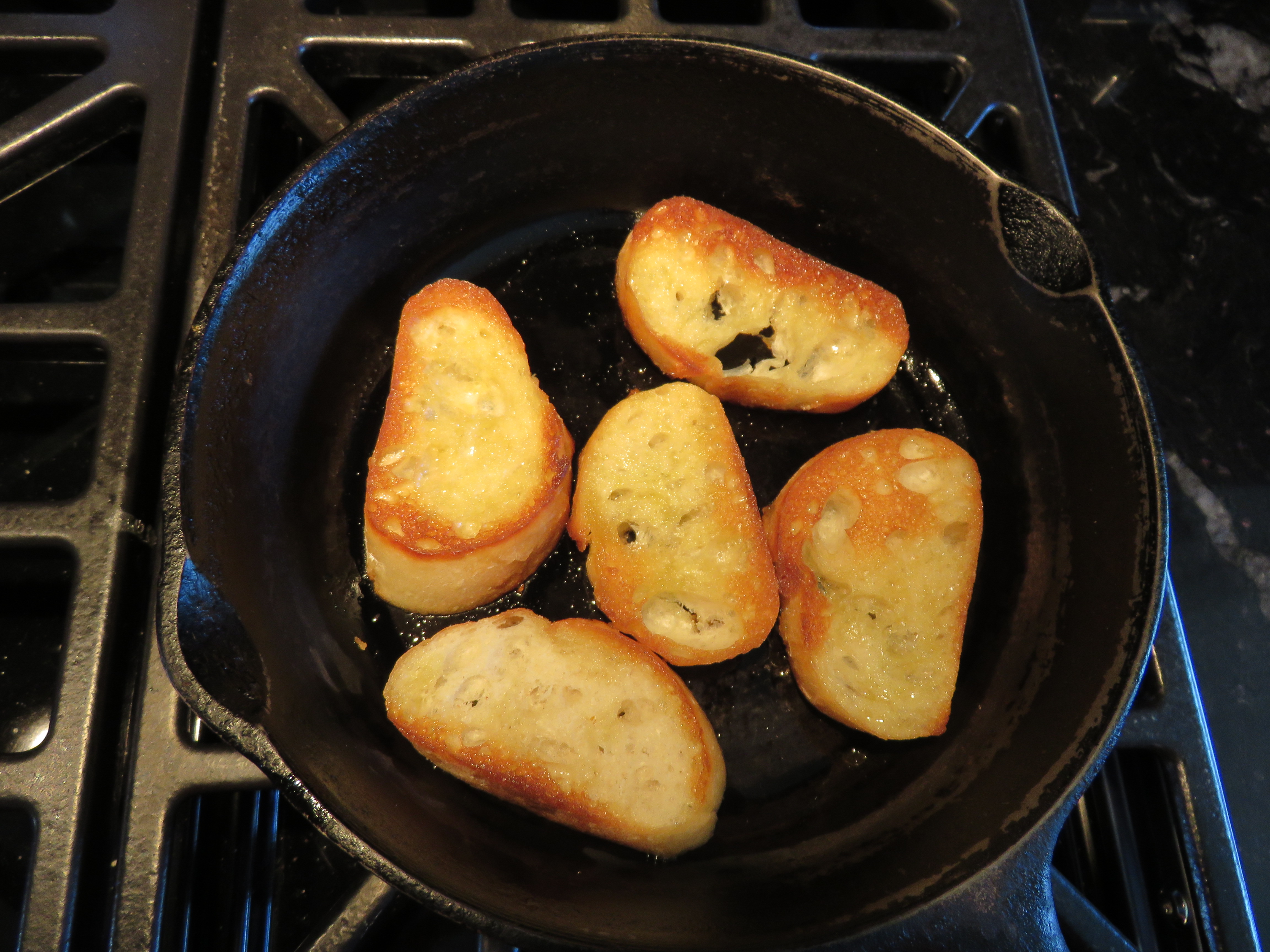 While the shallots cook, prepare croutons, fried in a mixture of olive oil and pancetta fat.
