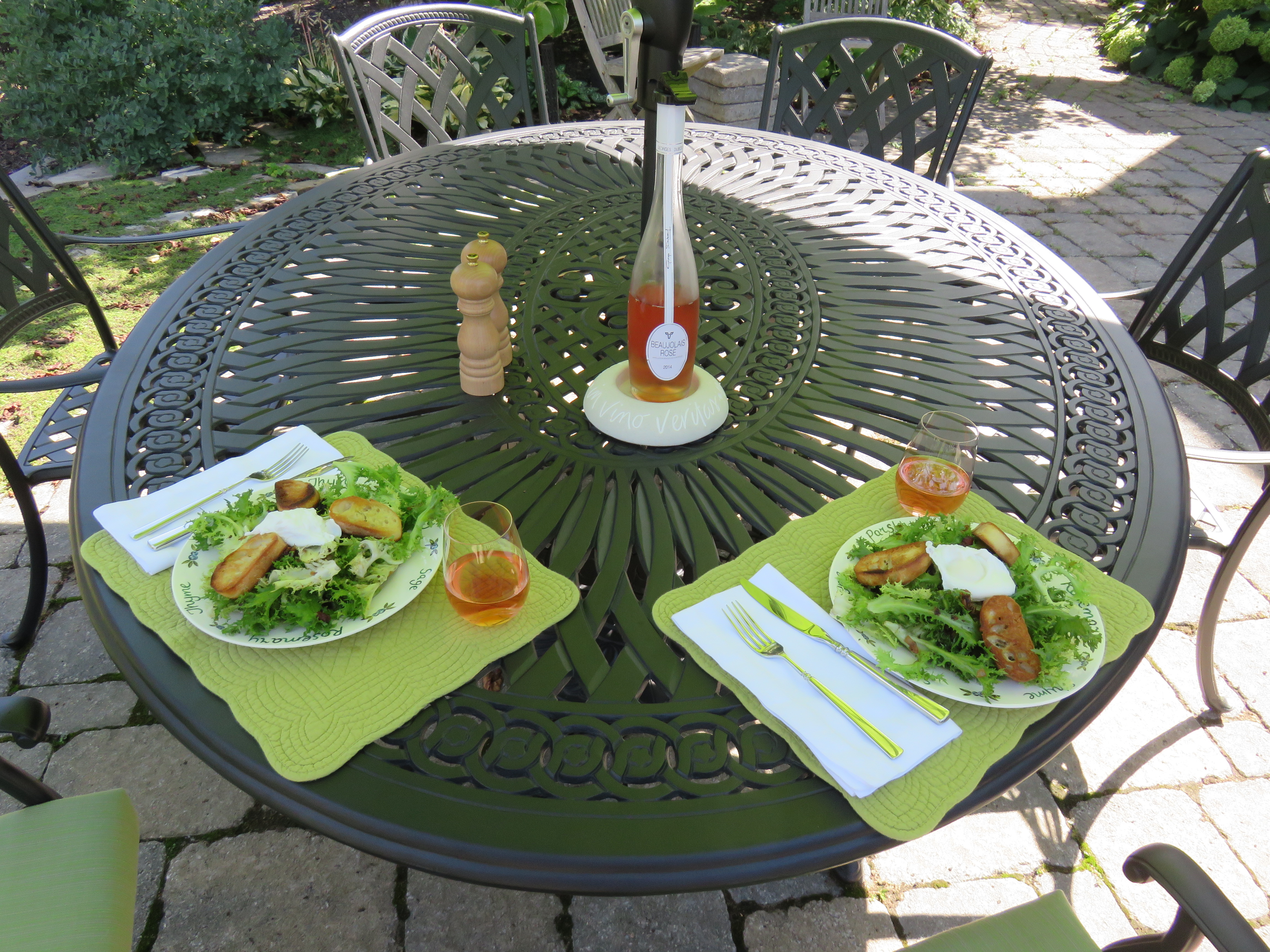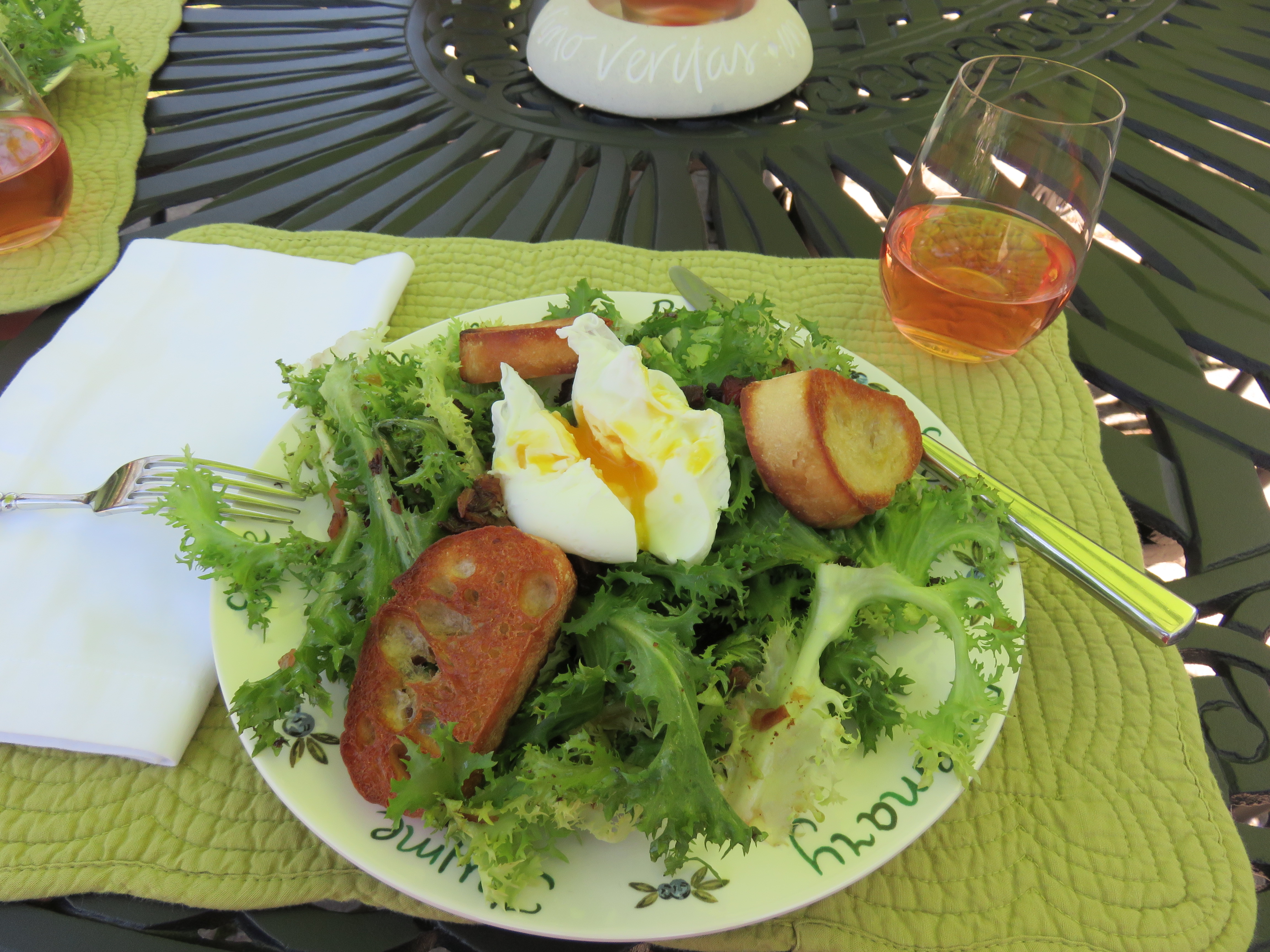 Finally, top with a poached egg, and transfer the plates to the patio. A glass of French rose wine is pretty much essential as far as I am concerned.