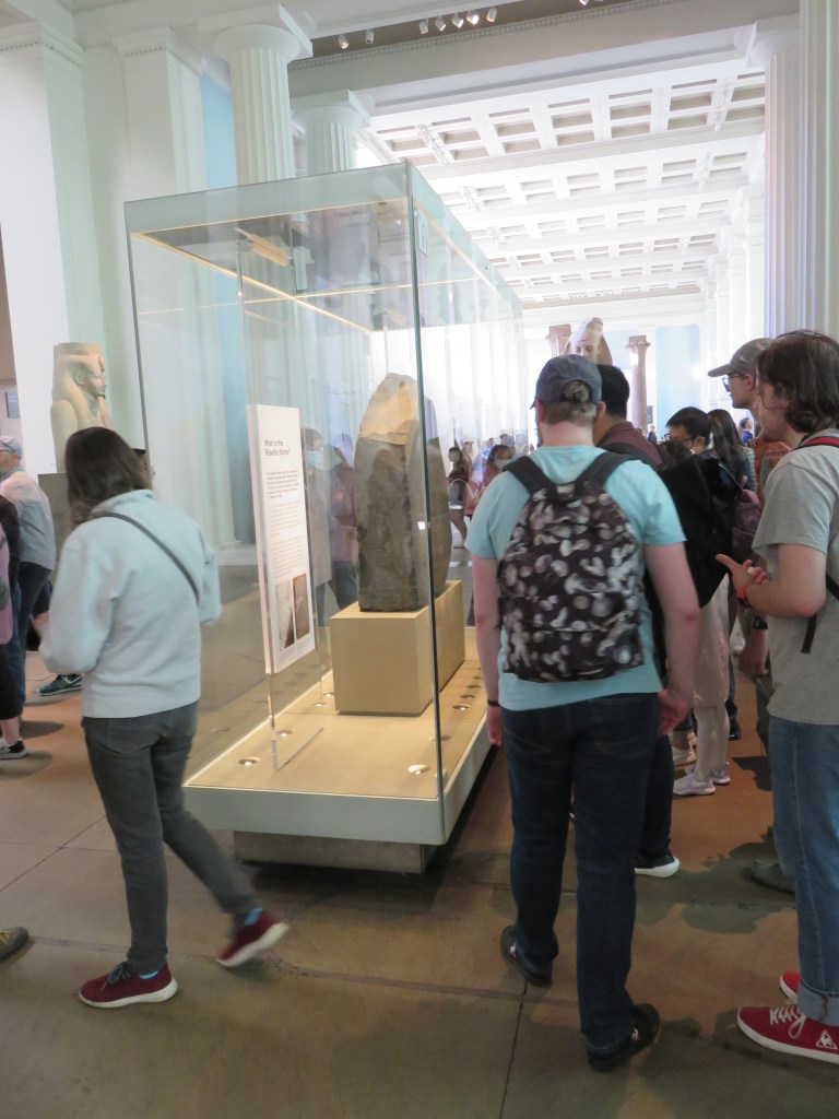And finally, I’ll leave you with a little story about my visits to the British Museum a very long time ago. The Rosetta Stone has been in the British Museum since the defeat of Napoleon. When we visited in the 90’s the Rosetta Stone was an important exhibit, but it was openly displayed, without a protective covering or even a sign saying “do not touch”. On my first visit I gently touched the edge (not where there is any writing, just to be clear) and no one said anything. A year later when I visited with my son, I told him to touch it, which he did with some hesitation. This time the security guard said “don’t touch”. (There still wasn’t a sign.) The next time we visited there was a rope around the stone, a plexiglass shield over the writing, and a “do not touch sign”. (I really can’t believe we were personally responsible for this, but who knows.) Anyway, when I visited the British Museum today, this is what I saw.