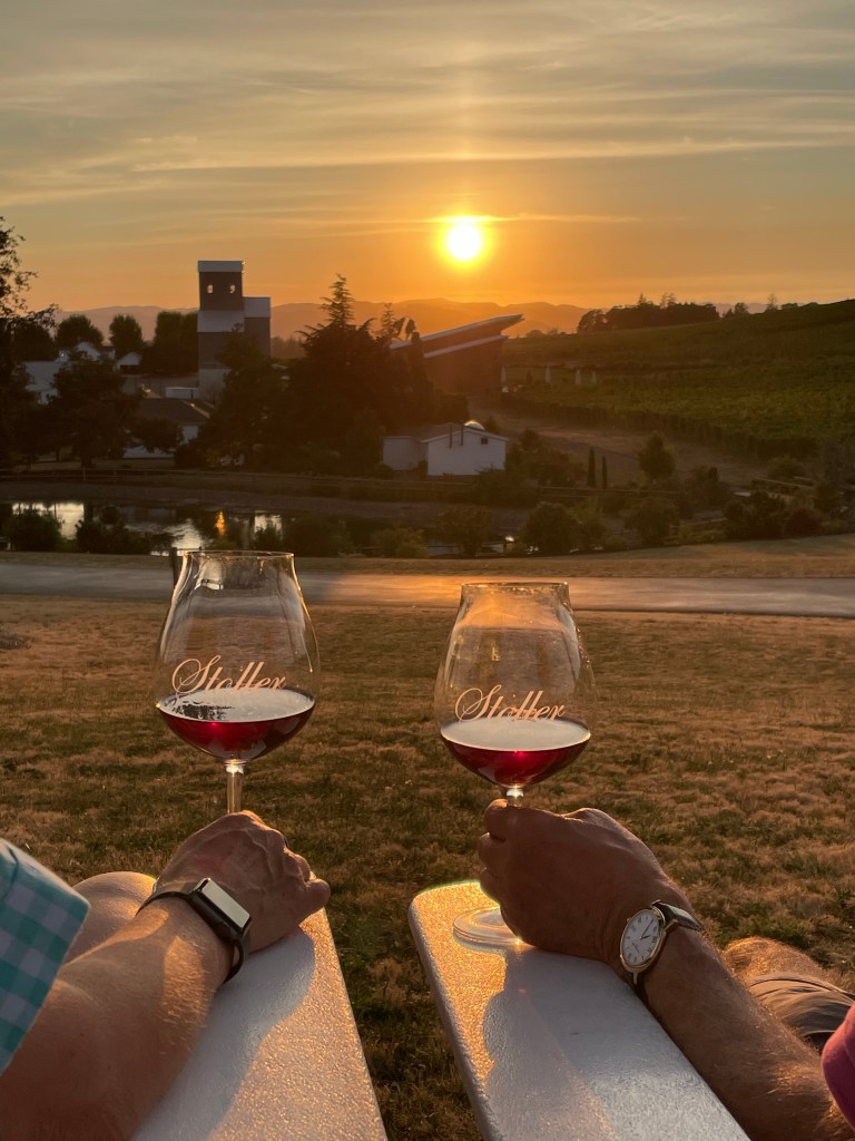 We visited two wineries yesterday – Elk Cove and Kramer Vineyards. At the first we tasted wines while looking out over the vineyard. At the second we watched birds of prey riding the air currents while searching for their dinner.