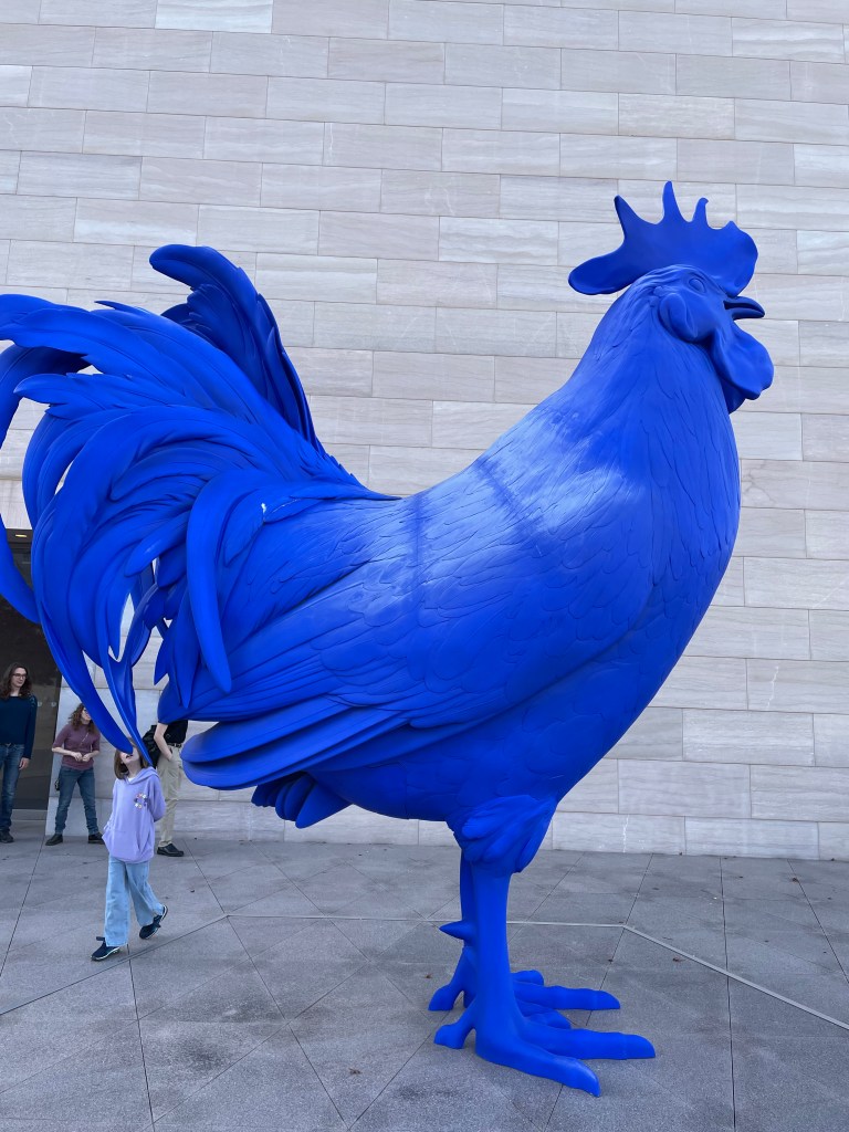 It was a beautiful, unseasonably warm November day in Washington DC. I was here on business, and we took the opportunity to extend our visit into the weekend. We spent Saturday enjoying the perfect weather and visiting the National Gallery of Art. A special exhibit on Vermeer’s Secrets caught our attention, but we also enjoyed some of the more unusual pieces of art. This was a large rooster sculpture on the outdoor roof patio.