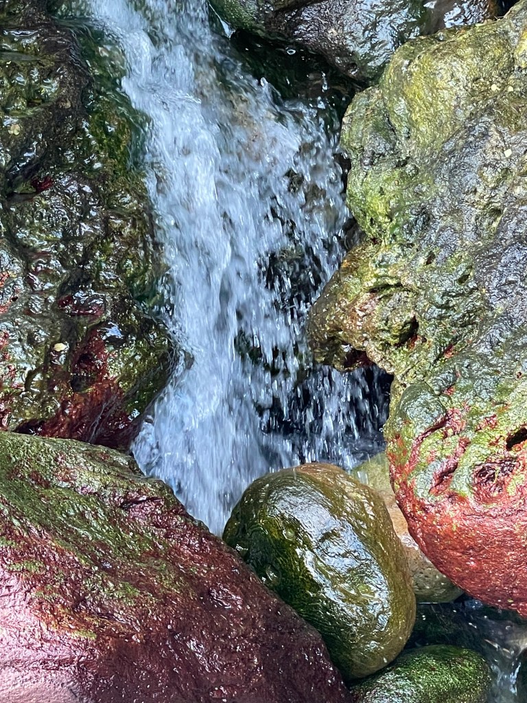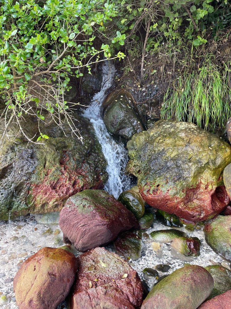 Most of the shore is rocky and the path is set back, but in one area we could walk along a sandy beach. I came across this scene with a small stream.