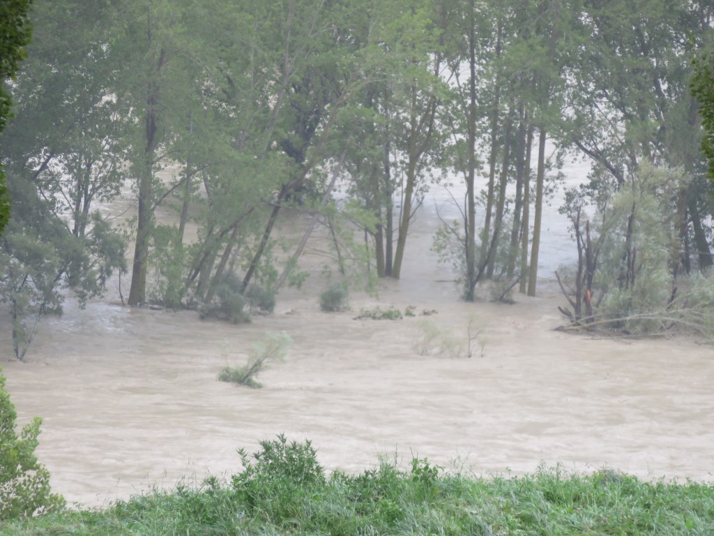We were fine, but others were not so lucky. The rain caused serious flooding – here is a sequence of pictures from our tent showing the river early in the storm, yesterday after it had passed (but the water was still rising), and then again today as it was beginning to ebb. The sequence shows land in the middle of the river, then all water, then land beginning to re-emerge.