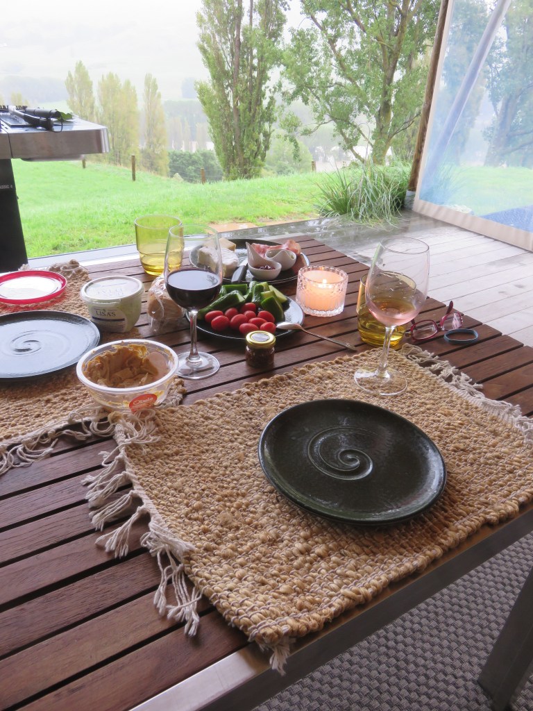Turns out I spoke a bit too soon. At 7:00 PM the wind was gusting and the rain was teeming down, but the tent was holding up fine (though it was very noisy inside) and we were planning to stay put for the night. But as we were getting ready for bed around 9:30, the owners “evacuated” us down to the main house. Apparently things were going to get a lot worse overnight. So we spent a fitful night listening to the wind howl, and woke up with no power, no cell service, no internet, and all the roads closed. Before you start feeling too sorry for us though, I’ll point out that we simply headed back up to the tent (which had survived the night just fine) and spent the day reading, playing Yahtzee, and enjoying the stunning views. Here is what we had for dinner -not exactly roughing it.