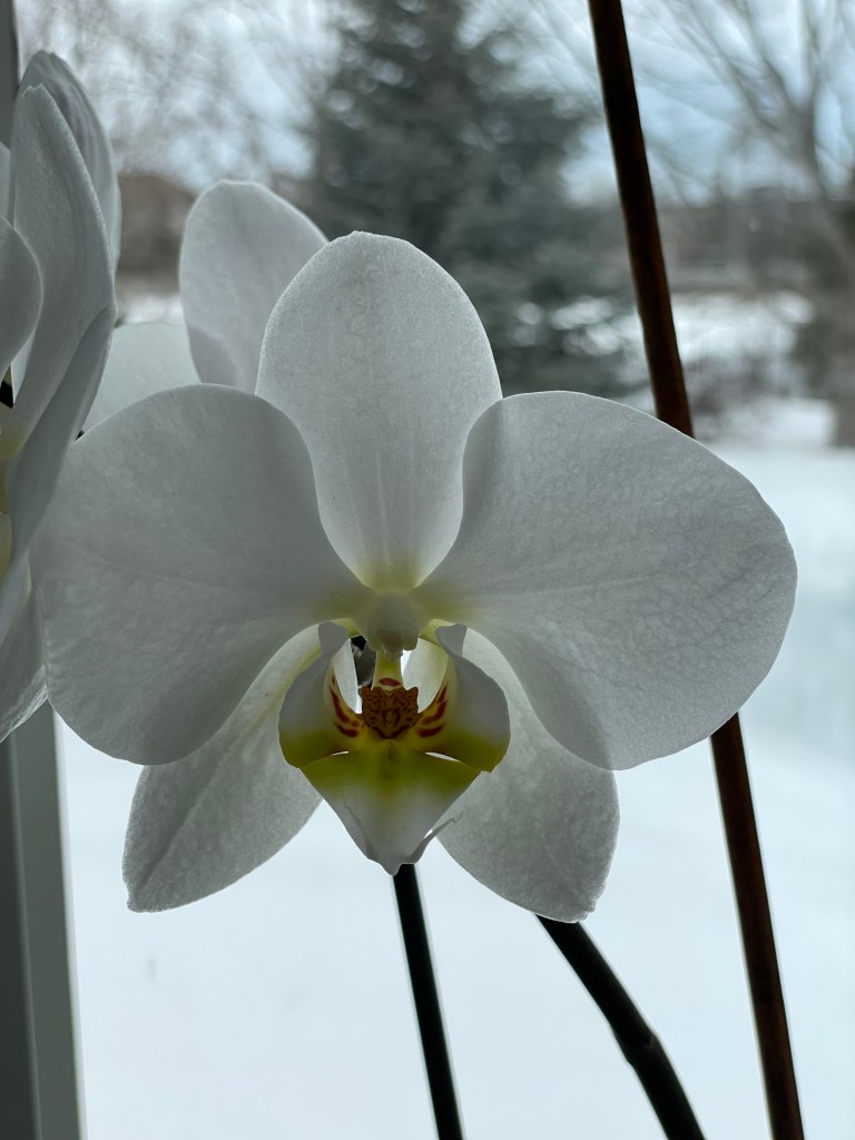 There aren’t any flowers outside, but the orchids are still blooming inside.