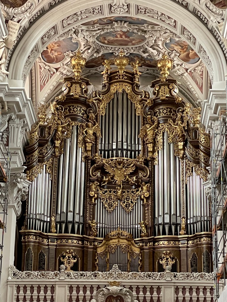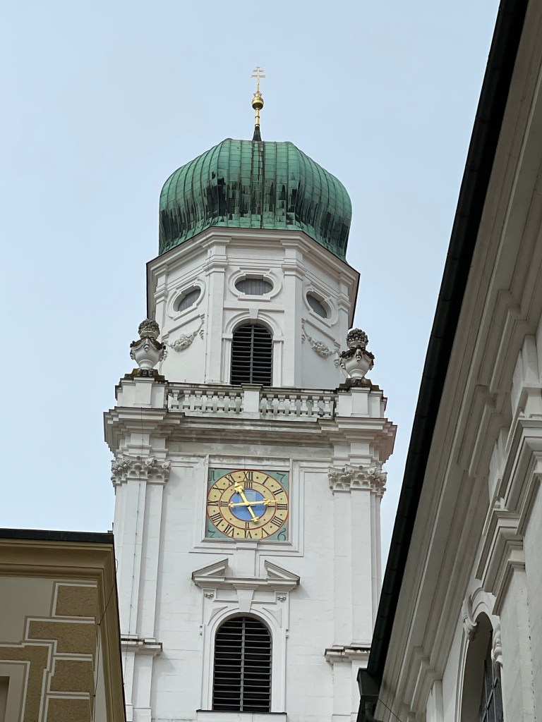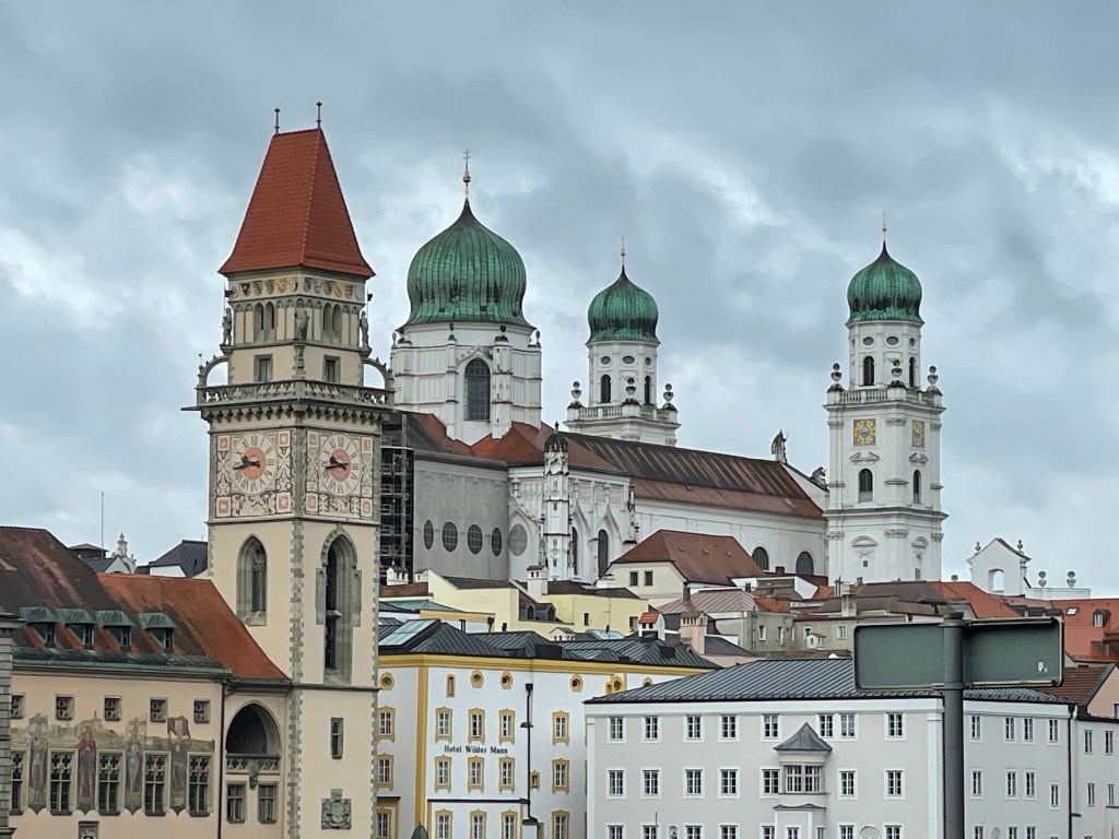 We had almost an hour before the boat was setting sail, so we wandered through the old city to look at St. Stephen’s Cathedral. I know I said that I don’t often post pictures from inside cathedrals, but I once again, couldn’t resist. Passau is a city of about 50,000, but it has 54 churches, 51 of them Roman Catholic. So it seemed you couldn’t really say you’d seen Passau if you didn’t visit at least one church. The outside of this cathedral is interesting because even though it is Roman Catholic, it has “onion domes” typically associated with Easter Orthodox churches.