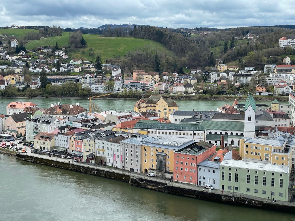 The view from the top is stunning. Passau is called the “City of Three Rivers” because … you guessed it … three rivers meet here. This pictures shows the three rivers meeting. The colour of the water is different for each river because of where they originate. Look closely at the water, and you should be able to see the three colours – black, to blue, to green.