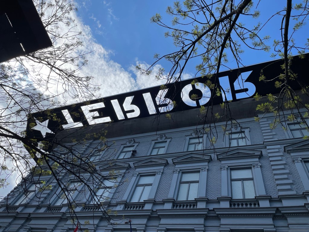 After arriving at the Hero’s Square, we started walking down the boulevard heading toward the Danube. We stopped for a delightful light lunch, sitting outside in the sunshine. Lunch was delicious, and the price was amazingly reasonable. After lunch, we continued walking toward the Danube, eventually passing by the Terror Museum. It appears that the name is designed to be seen from the air.