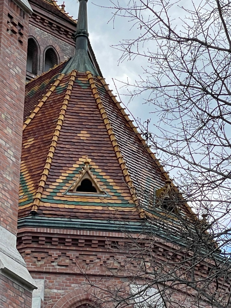We had a tour of the castle on the Buda side on Sunday, but that time we took a bus to the base of the hill. Today we decided to walk from our hotel, then climb up the steps to the castle complex. All told, we walked about 10 km, so we felt we earned our wine with dinner. The first interesting sight we saw along the way was a church with a tiled roof. It wasn’t the tiled roof that made it stand out, but the fact that it was a Protestant church. I think it was the first one we’ve seen on this trip.