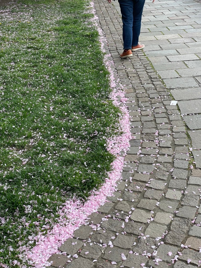 The petals are beginning to fall, coating the ground with something that looks a little like snow or hail, but is far more pleasant. I definitely prefer this.