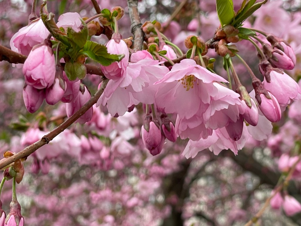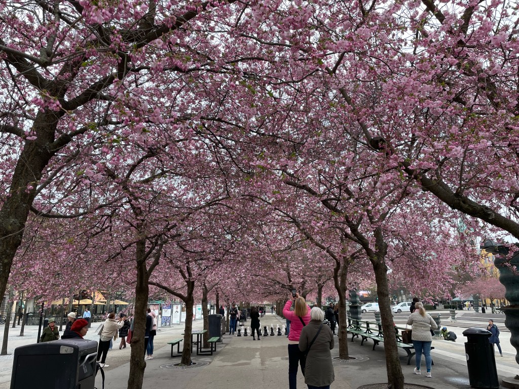 When we were in Budapest the cherry blossoms were at their peak, perhaps even a day or two past peak. The ground was beginning to be covered with “drifts” of fallen petals. A week later, the cherry blossoms in Stockholm weren’t quite as far along (not surprising, given how much further north it is). But they were still beautiful.