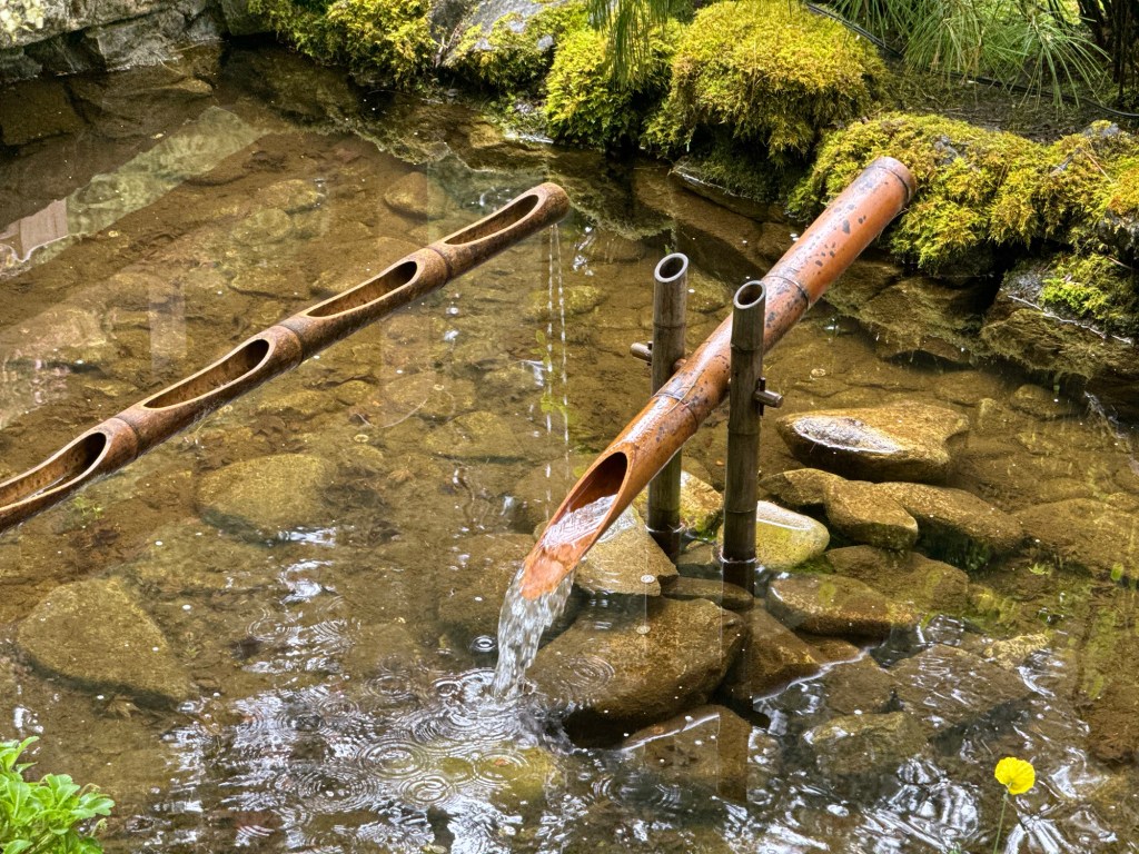 The weather has been fantastic for our visit to B.C. Until now, anyway. The last few days haven’t been quite as nice, with cloud, drizzle, and then outright rain. This picture is from our visit to Butchart Gardens, in the Japanese garden. It shows a Shishi-odoshi, designed to frighten away animals like boars. It sort of sets the mood for the rain we are currently experiencing.