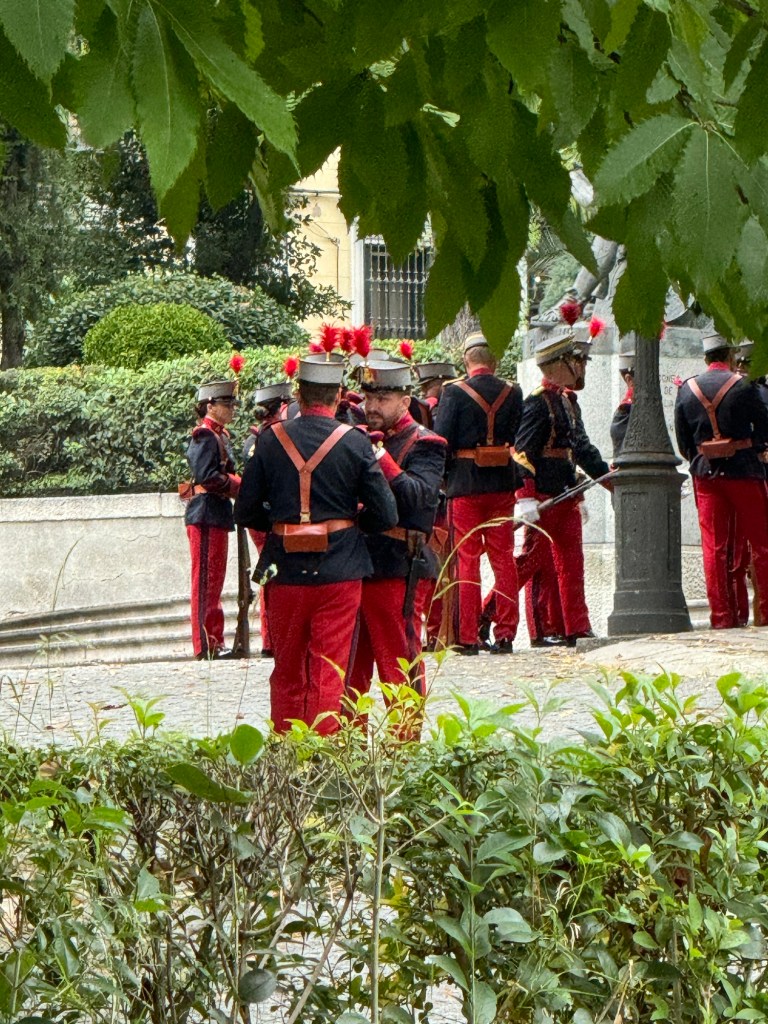 There was a large crowd on the sidewalk and we could hear a marching band. We briefly thought it was another protest, but it appears it was a military ceremony – perhaps a changing of the guard – it wasn’t clear. We didn’t stop to watch because we couldn’t see that much through the crowd, but a little further along we could see other ceremonial troops getting ready for action. I love the optical zoom on my iPhone…