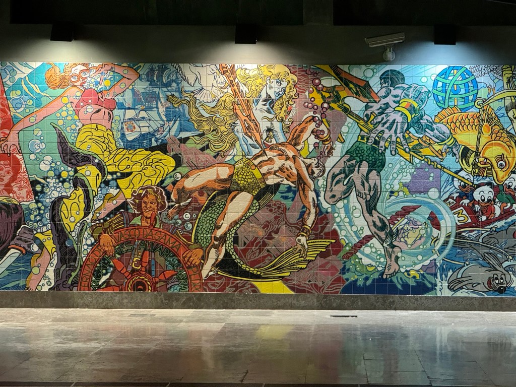 After a little research (thanks Jan) we discovered there were two bus lines that ran hourly buses to Porto, leaving from the Lisbon Oriente station. It was possible to book tickets online but … you can probably see where this is going – after our previous experiences we were reluctant to book anything without talking to a live person. And a dry run to see how long it took to get to the Lisbon Oriente station just seemed like a good idea. So, after lunch, we were off. Along the way, we were treated to some of the lovely art in the stations.