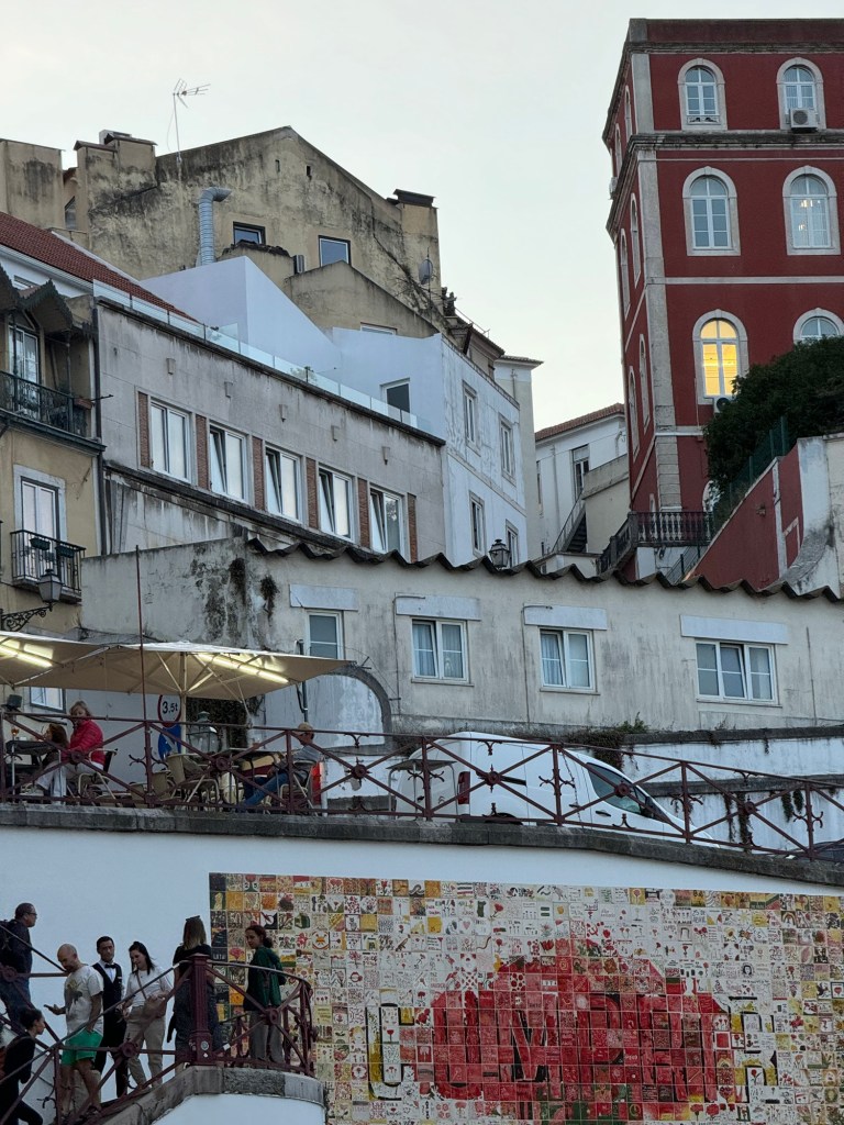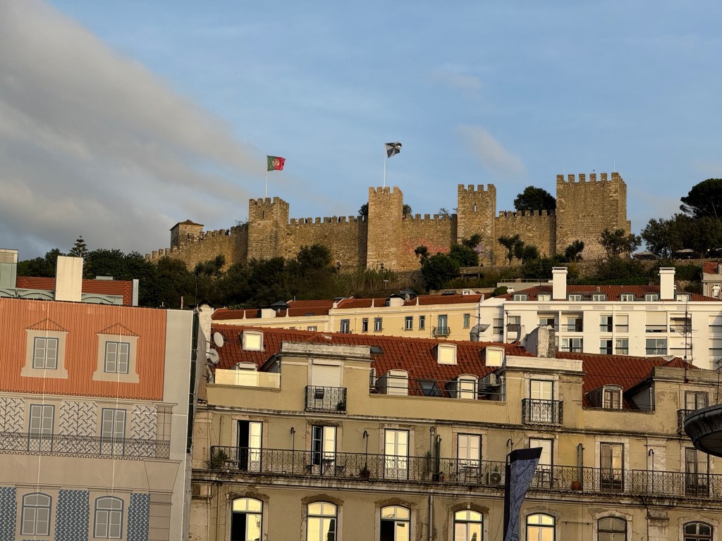 It took a while, but we found the bus station, and eventually we found a ticket booth with a person in it. I’m happy to say that our tickets are booked, and we’re all set, at half the price of the train. Then it was back to our hotel. Lisbon is rather hilly, it turns out. Our hotel is in a relatively flat area, but on either side there are very steep hills. Here is a view of the castle – Castelo de S. Jorge.