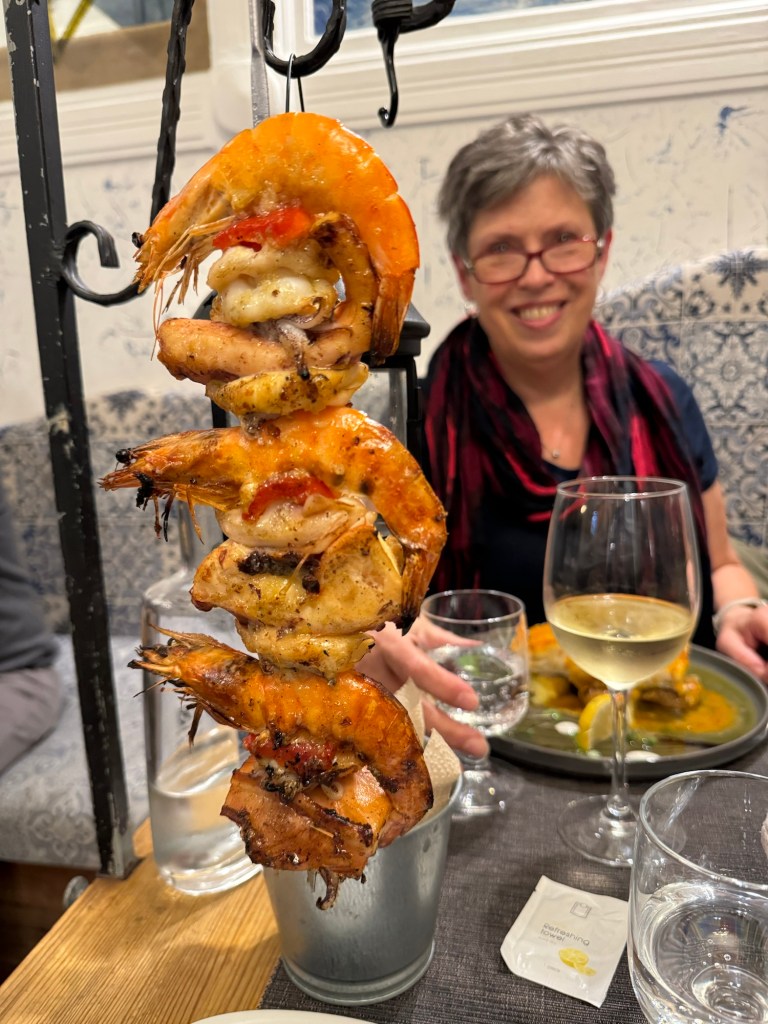 After several rest stops, we finally made it to the apartment, and then we had to head back down to our hotel, for a rest before dinner. Speaking of dinner, on our travels we came across a small restaurant, just a little off the beaten path, with Portuguese specialities and we decided to have dinner there. We were very pleased with out meals – I opted for the seafood skewer.