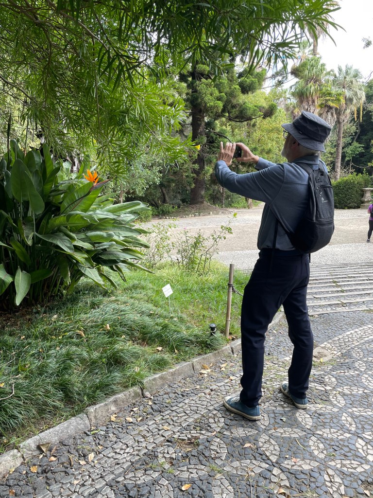 We found a route to the Botanical Garden with only a few flights of stairs, but we couldn’t find a way that didn’t have any stairs. And then, when we got to the gardens, more steep paths and steps, with patterned paving stones. That’s me, taking more flower pictures.