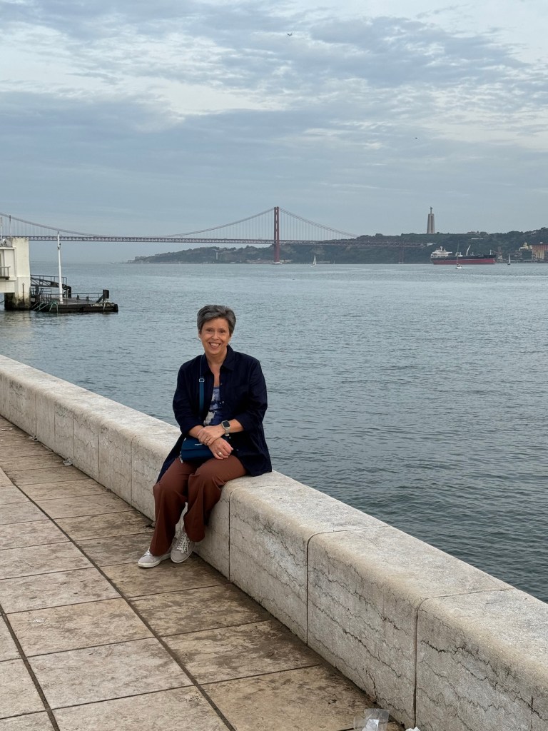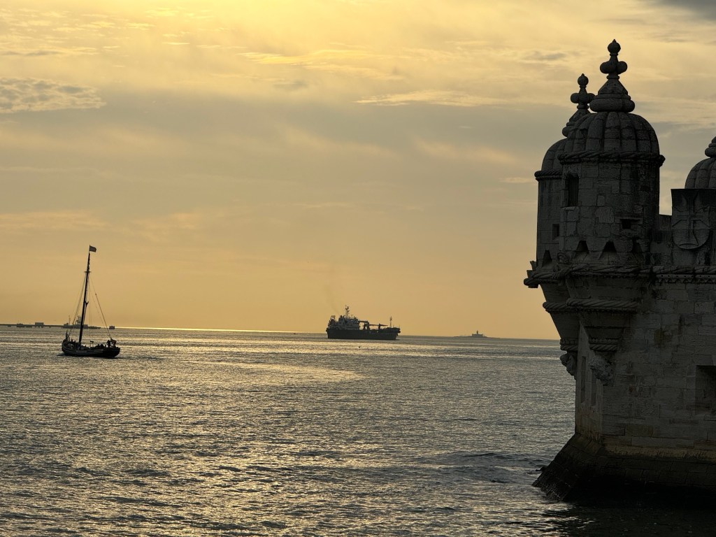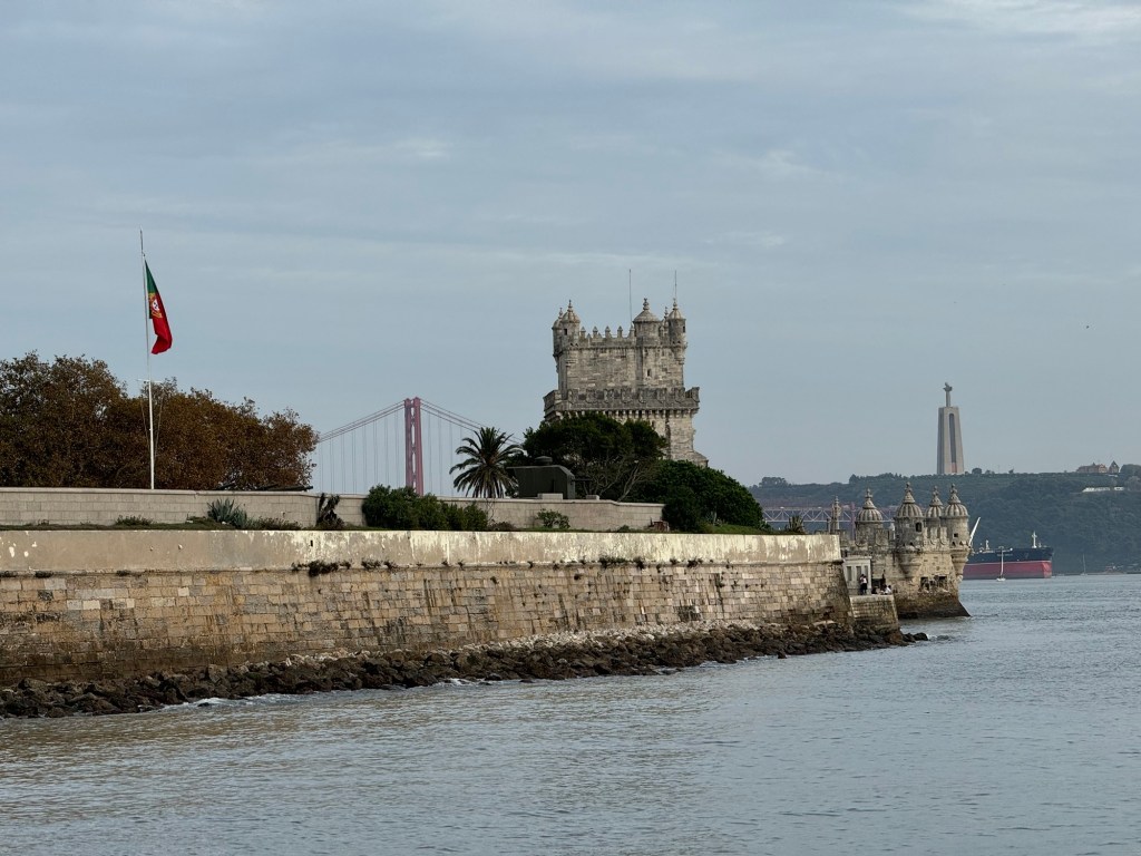 After finding the tram, we headed off for Belem tower, until … we stopped. The doors opened, the air conditioning stopped, and the driver made an announcement in Portuguese. Eventually this was followed by another announcement, this time in Portuguese and English. The power was out, and we were stranded until it was restored. No ETA was offered. Fortunately, Jan used this opportunity to begin researching restaurants, either near Belem, or near our current location. We were within minutes of bailing when the power came back and we were on our way. Our first objective at Belem was Darwin’s cafe for lunch. It was a lovely day and we sat on the patio enjoying this view.