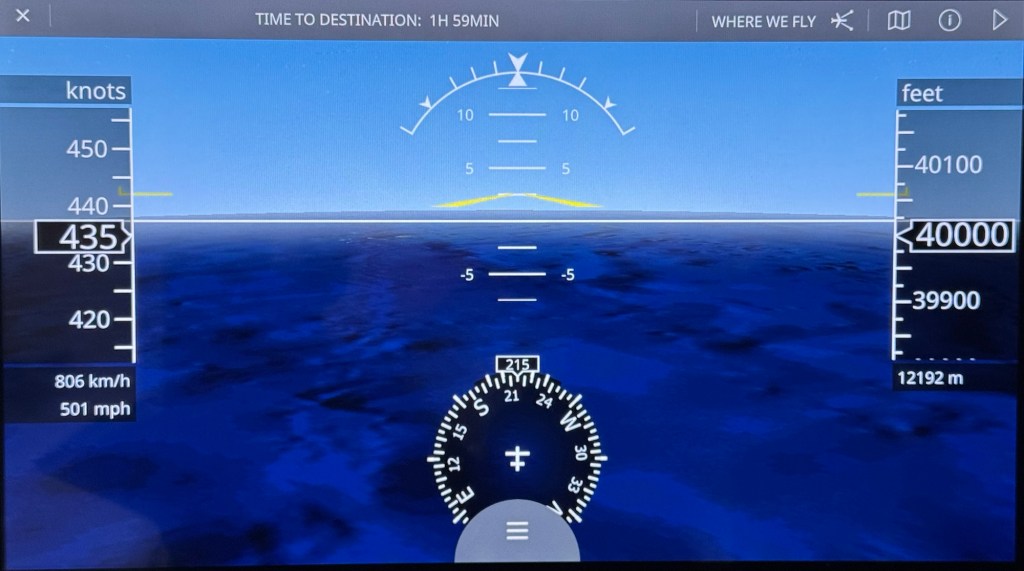 I had more luck than Jan – I got a solid seven hours. I’m told there was no doubt that I was sound asleep because I was snoring … loudly … loud enough to be heard over the cabin noise. I can neither confirm nor deny this.