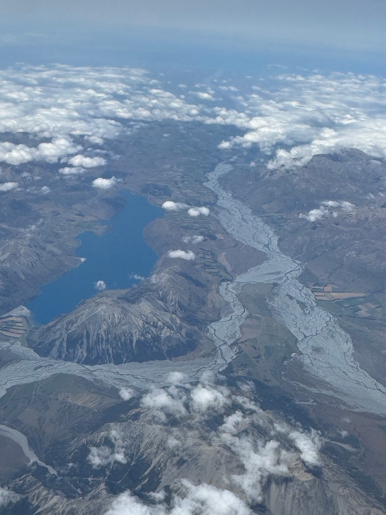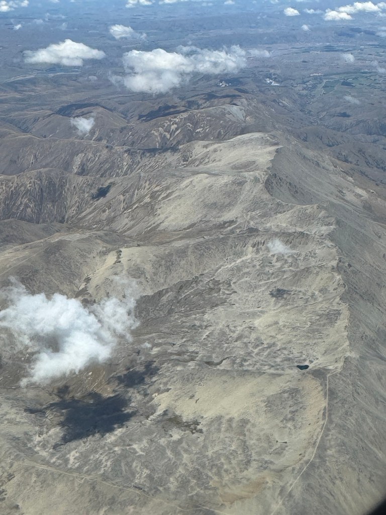 After a solid night’s sleep in Auckland, we had a two hour flight to Queenstown today. I selected a window seat, because I was hoping to see New Zealand’s lush green landscape. Instead, for the first hour I saw featureless cloud cover. And when the cloud cover finally dissipated, I saw…