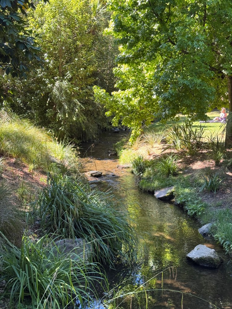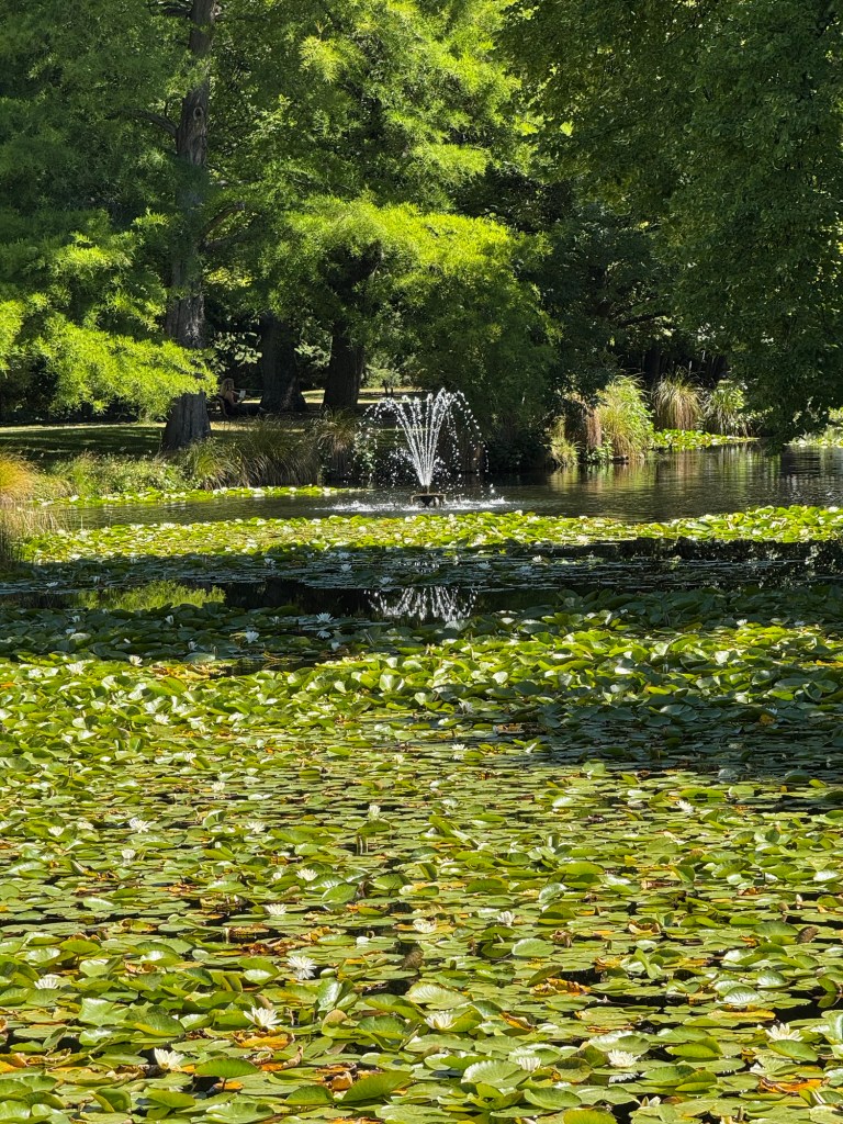 At home today, school buses were cancelled because of a snowstorm. Here, we changed into shorts and a t-shirt and walked along the lake to head into town. The path took us through a small park.
