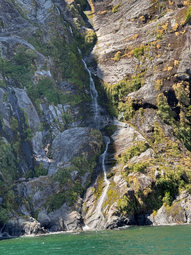When we were on the boat ride, we saw more examples of hanging valleys, with lakes in the valley and waterfalls into Milford Sound.