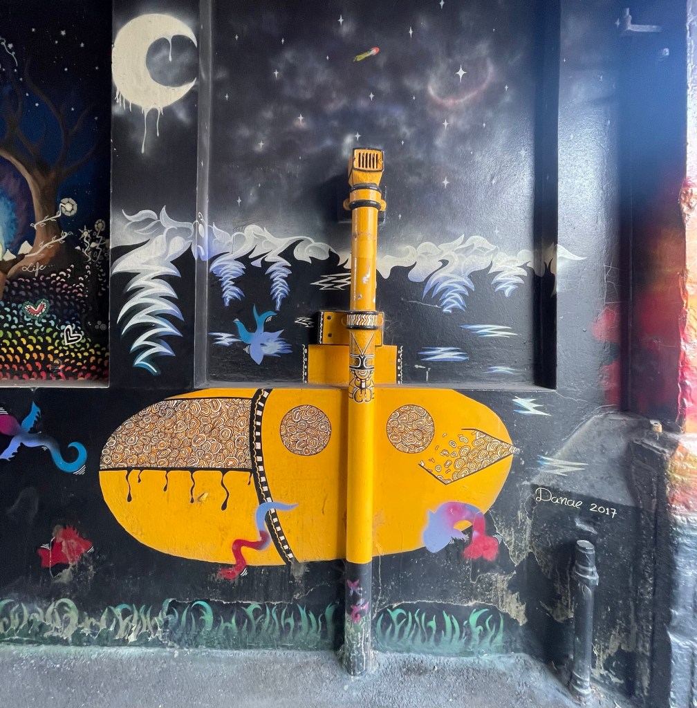 Some of the walls are a mostly blank canvas, but others have pipes and vents. Some murals work around these obstructions, while others actively incorporate them into the mural. I like the way this yellow submarine incorporates the vent.