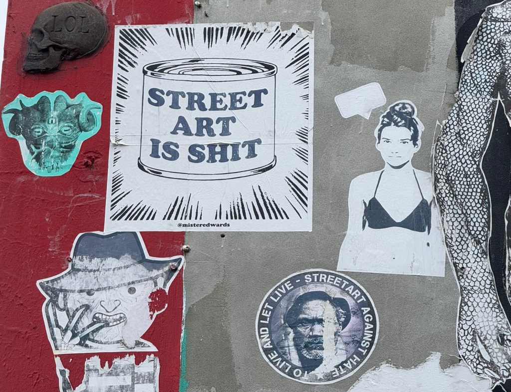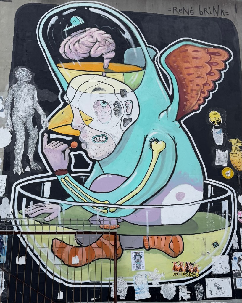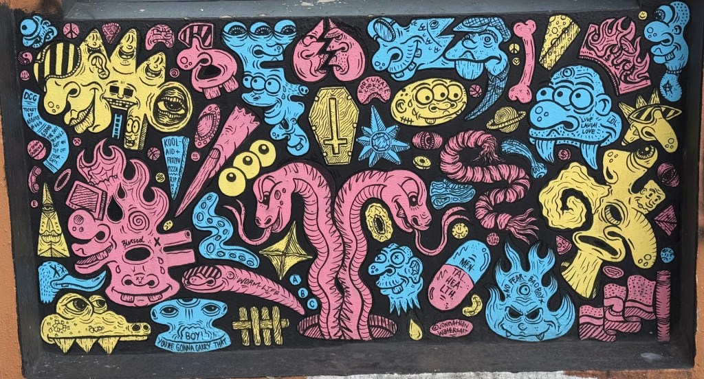 This next one shows how the boundary between mural art and true graffiti begins to blur here. But it does it in a way that doesn’t deface the art, but is respectful and in many ways complements it. I like that too.