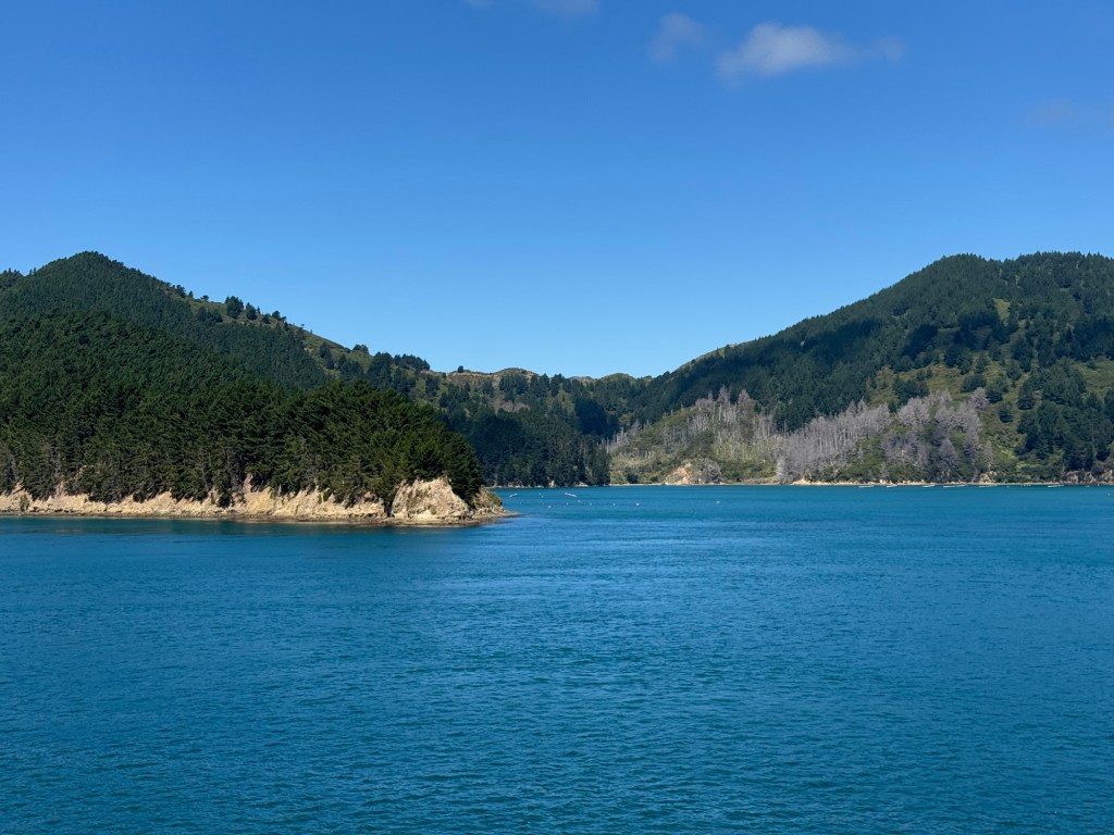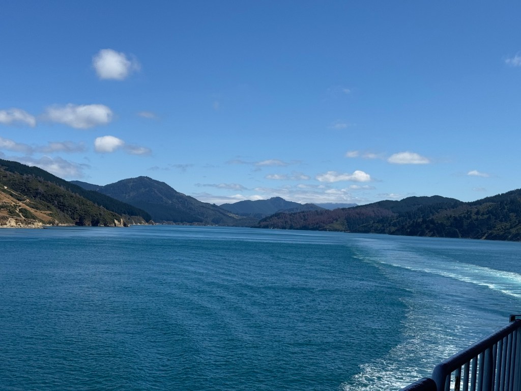 The seas were calm, but even so, you could definitely feel the boat rolling gently. We were very glad it wasn’t a stormy day. The landscape changed dramatically as we went along. This seems to be another theme in New Zealand. I’ll post a few taken pictures from the ferry to give you an idea.