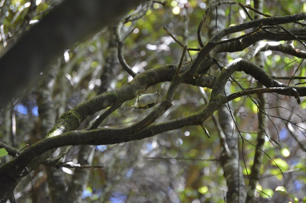 It was getting late, so we headed back and spotted a Rifleman or tītipounamu. Look carefully and you will see it hanging upside down from the branch.