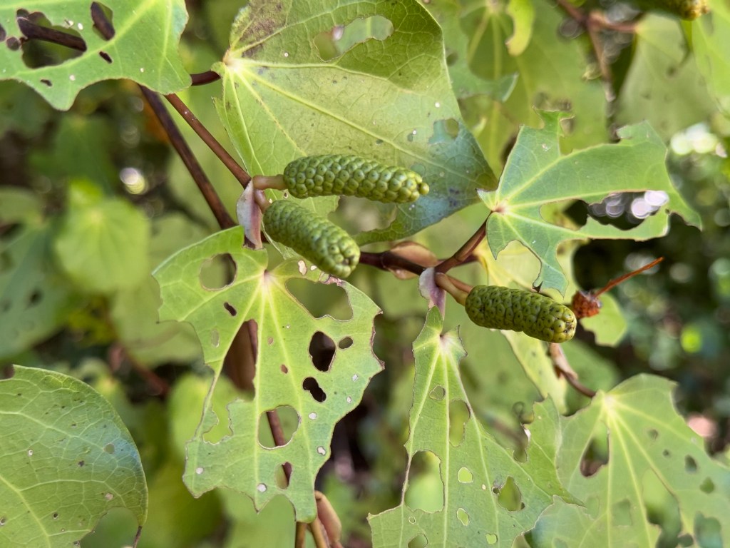 This next plant is the Kawaka, which a local caterpillar loves. When it eats the leaves, the Kawaka produces a substance that the caterpillars don’t like, so they move elsewhere. But this substance has useful medicinal properties, so the partially eaten leaves were prized by the Māori.