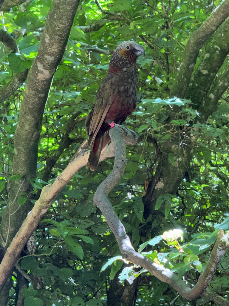 The Kaka is a native New Zealand parrot, and like all parrots, they are intelligent and very dexterous with their feet. We watched them open the feeders and then hold the food pellets in one claw as they ate them.