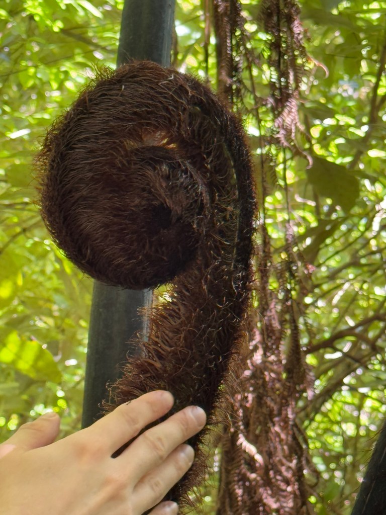 The main focus of Zealandia is the native New Zealand birds, but they are also trying to create the natural vegetation as well. It looks so strange to us, like something out of Jurassic Park. I’ll include a few shots to give you an idea. The first picture is a fern. Note the regular dots on the surface of the leaves. On one plant you can see the underside, which shows that they are spore sacs.