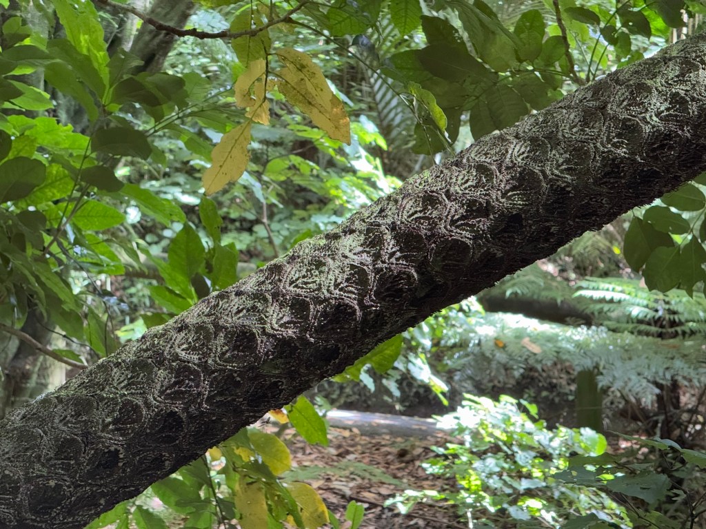 The other fern is the silver fern, with a trunk that looks like this. The underside of the leaves of the silver fern are … wait for it … silvery, and the Māori would cut the branches off and turn them upside down on paths to make them visible at night.