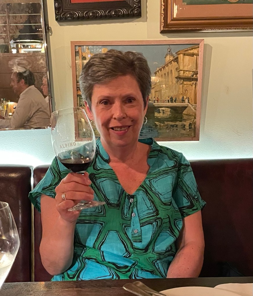 Okay, one other candidate. Here is a picture of Jan at dinner, wearing her new (beautiful) summer dress.