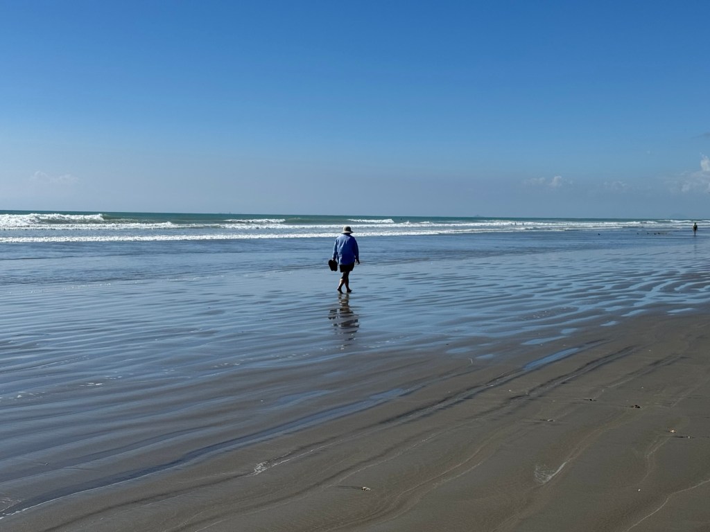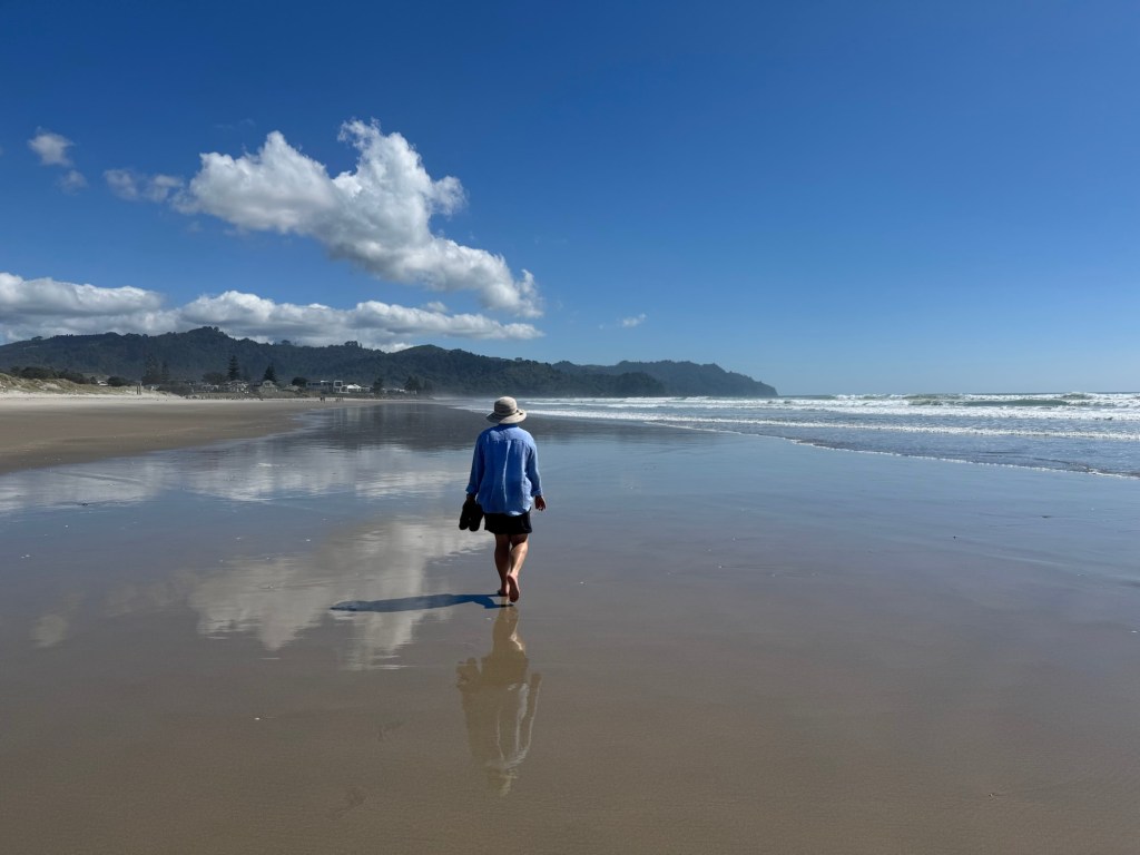 This beach was very flat with a shallow grade, which makes it a very wide beach, perfect for walking or swimming. I think it was even better than the beach at Mount Maunganui. As the water drained out after a large wave, the surface of the wet sand was like a mirror. Here’s another picture with a reflection, similar to the one from yesterday.