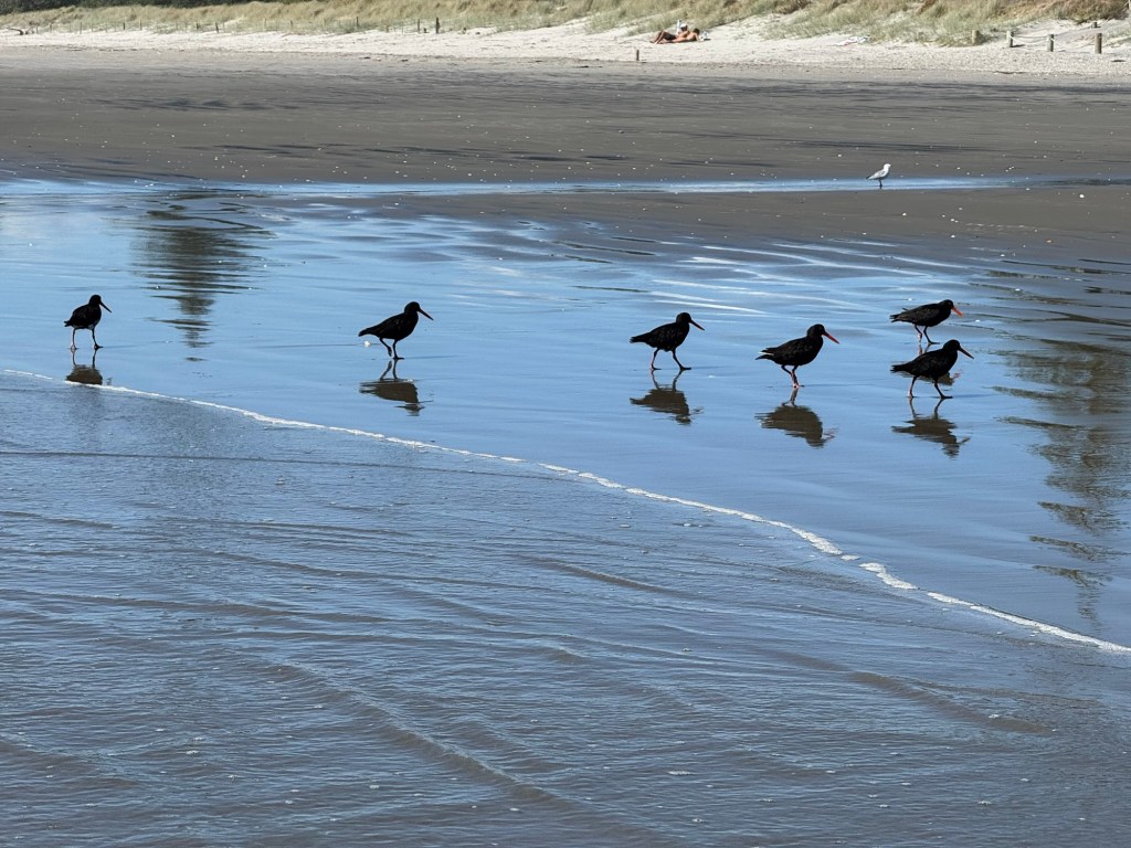 As we were walking on the sand, the waves occasionally washed over our feet, so we would move higher up the beach. The Variable Oystercatchers were also walking along the sand, and when the water came in, the oystercatchers would also run up the beach toward dry sand … just like we were doing.
