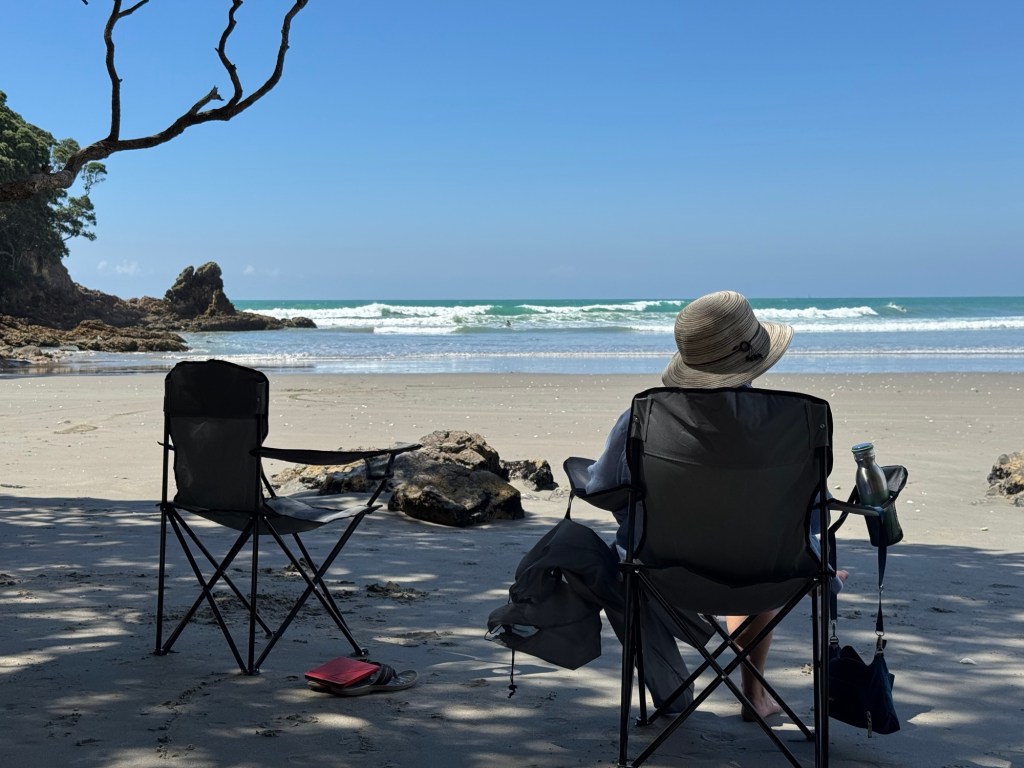 At the very beginning of our trip, when we were in Queenstown, we bought two folding camp chairs so we could sit on the beach. We’ve been here four weeks and the chairs haven’t moved from the back seat of our rental car. We just haven’t found an opportunity to use the chairs. That changed today!
