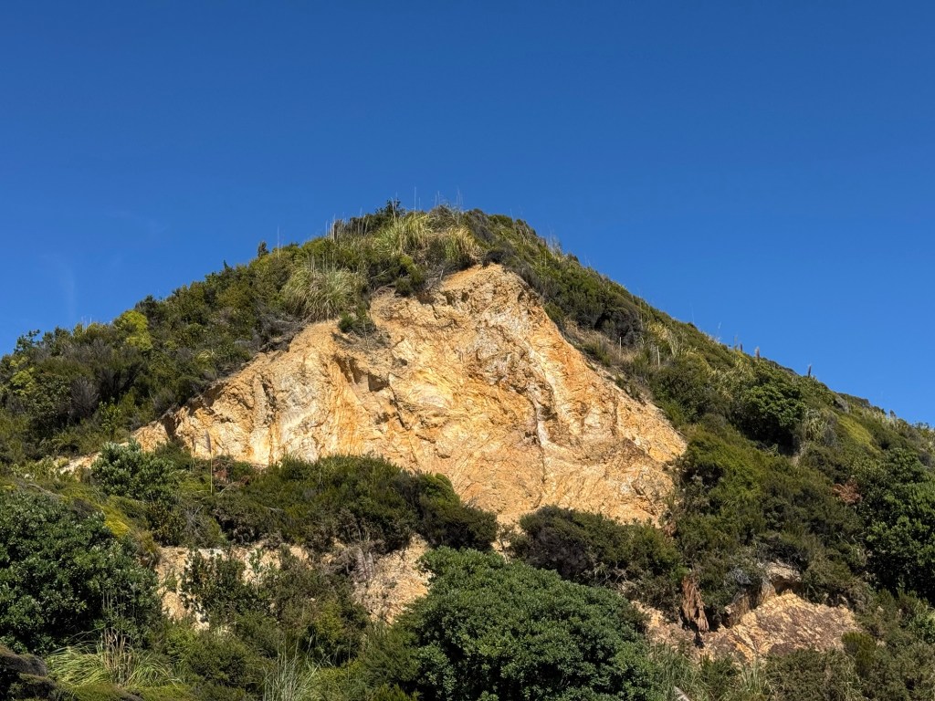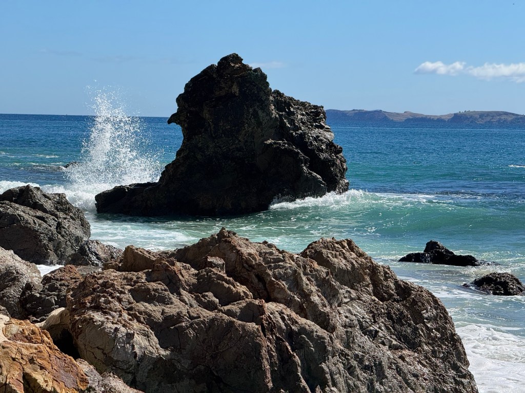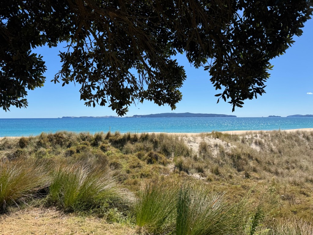 We moved from the east coast to the west coast of the Coromandel today. It’s a short drive – only 47 km, but the roads are very narrow and winding, so Google maps says that the trip could take up to an hour. We found that to be pretty accurate. You can do the math and figure out how fast (slow) we were driving. But even with a very slow drive, we still had time to kill before we could check into your next hotel. So we decided to check out … wait for it … more beaches. I saw at least three beaches along our route, but one looked particularly interesting. It was a bit off our path, and had an access road that was even narrower and steeper than the rest of the drive, but it turned out to be well worth it.