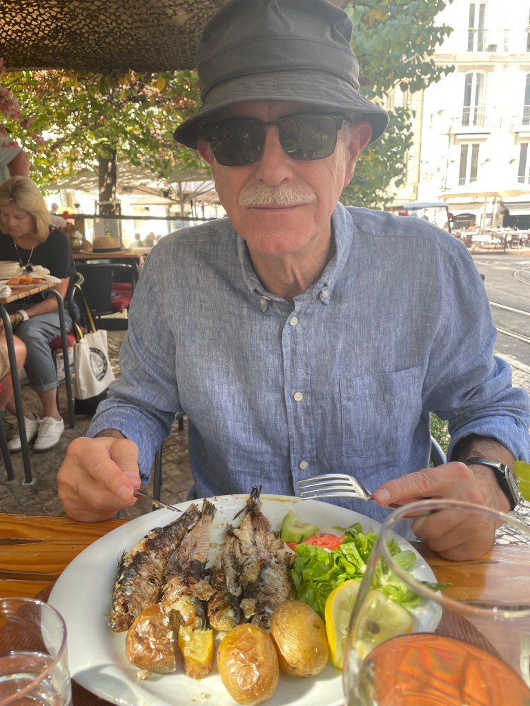 One thing we often wonder about when traveling is where to have lunch. We spotted a pleasant outdoor cafe with an open table and I went for something with local character – sardines with potatoes. Again, really quite good.