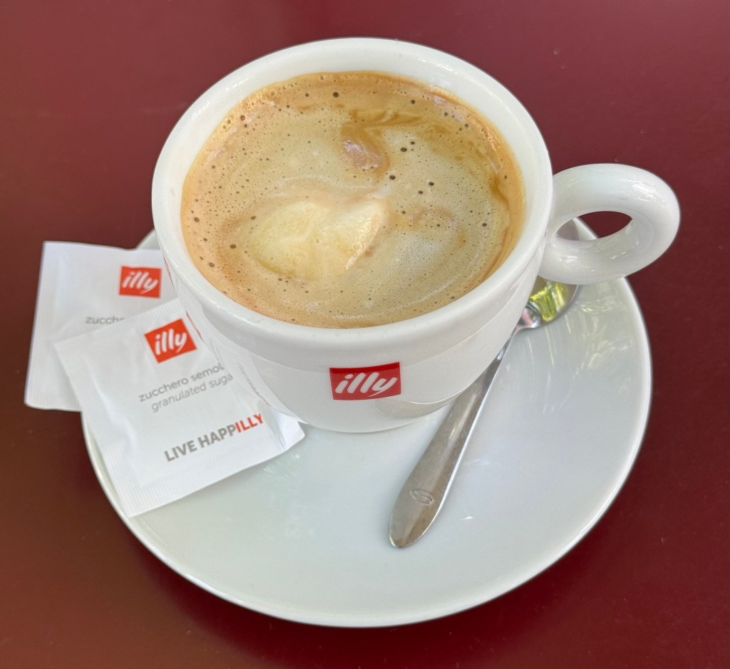 We did have one important housekeeping item (getting my European SIM card) but once that was done, we stopped for coffee in a pleasant outdoor square. I was thinking “latte” until I saw “espresso with gelato” on the menu, and decided I needed to check it out. It’s quite good – a little on the sweet side for me, but definitely worth trying.