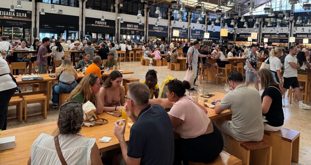 After lunch it was time to wander again, and of course, to wonder … what to have for lunch tomorrow. Last year we walked through Time Out, a giant food hall featuring local chefs. It was interesting, but overwhelming. We had another look today. The central court has seating for hundreds, with booths around the periphery showcasing local food and wine.