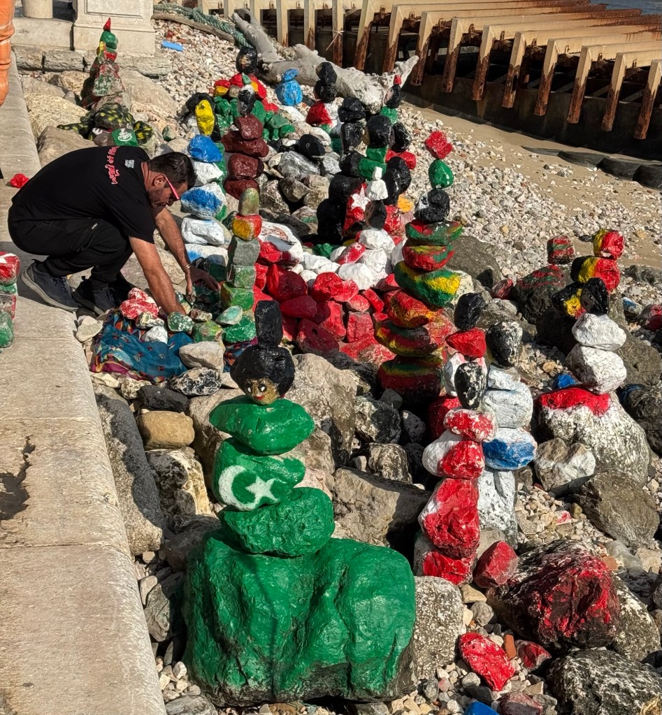 We’ve penciled it in for a late lunch tomorrow. With tomorrow’s lunch taken care of, it was back to wandering. It was a warm day and the cool breeze coming off the water was wonderful. We headed along the river toward the city center and came across a small village of stones stacked and painted to look like people. One incorporated a basin for tips and the artist was collecting them as we walked past.