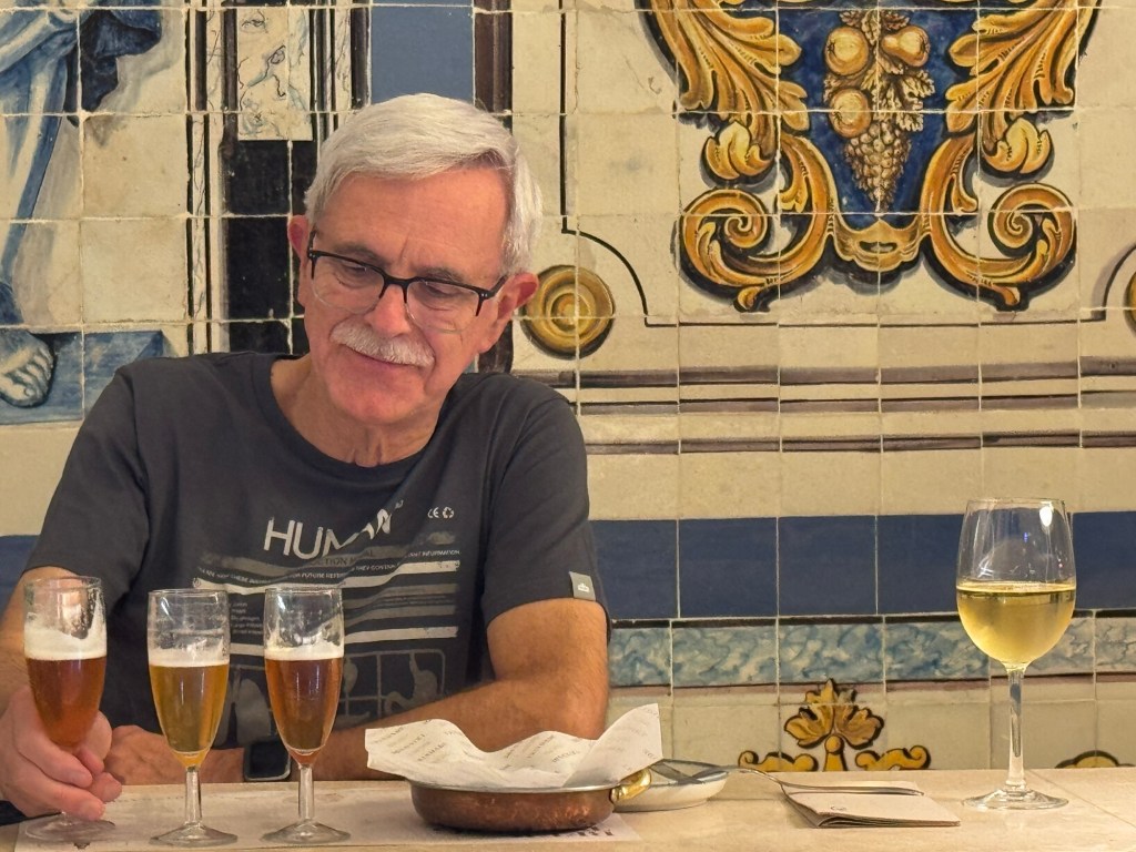 I’m closing with a picture of me pondering my beer with Jan’s vino verde in the picture, and behind me a tiny hint of the tile work that adorned the walls.
